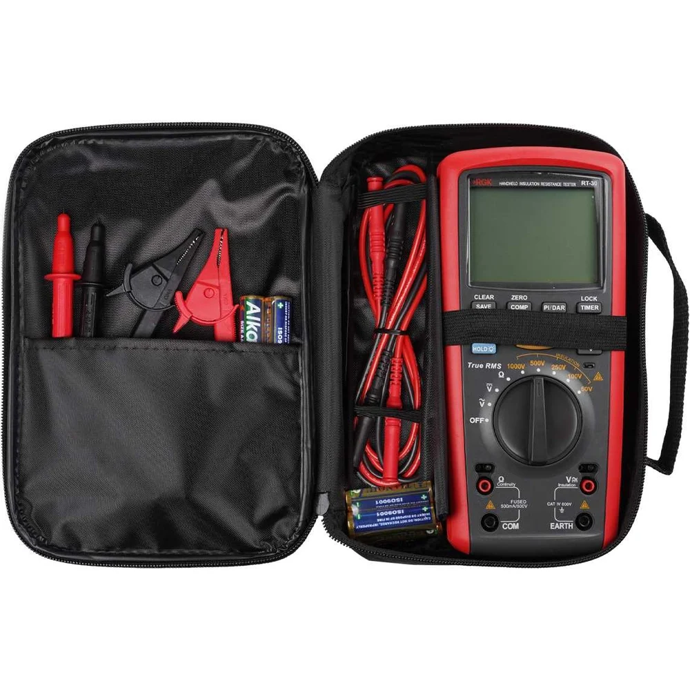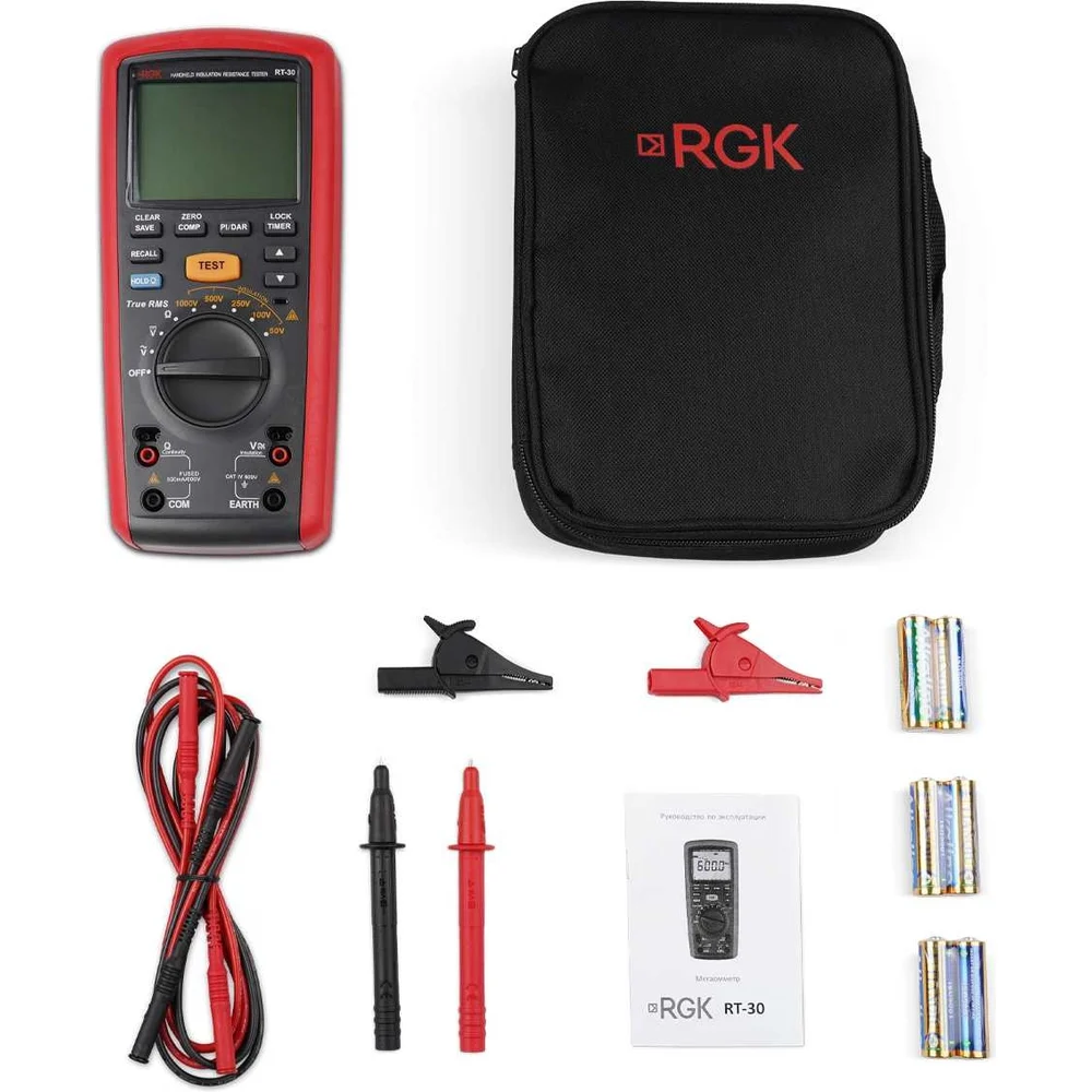 Комплектация Мегаомметр RGK RT-30; Чехол; Зажим типа «крокодил», 2 шт; Измерительный наконечник, 2 шт; Батареи питания, Тип АА, 6 шт; Руководство по эксплуатации; Комплект измерительных проводов