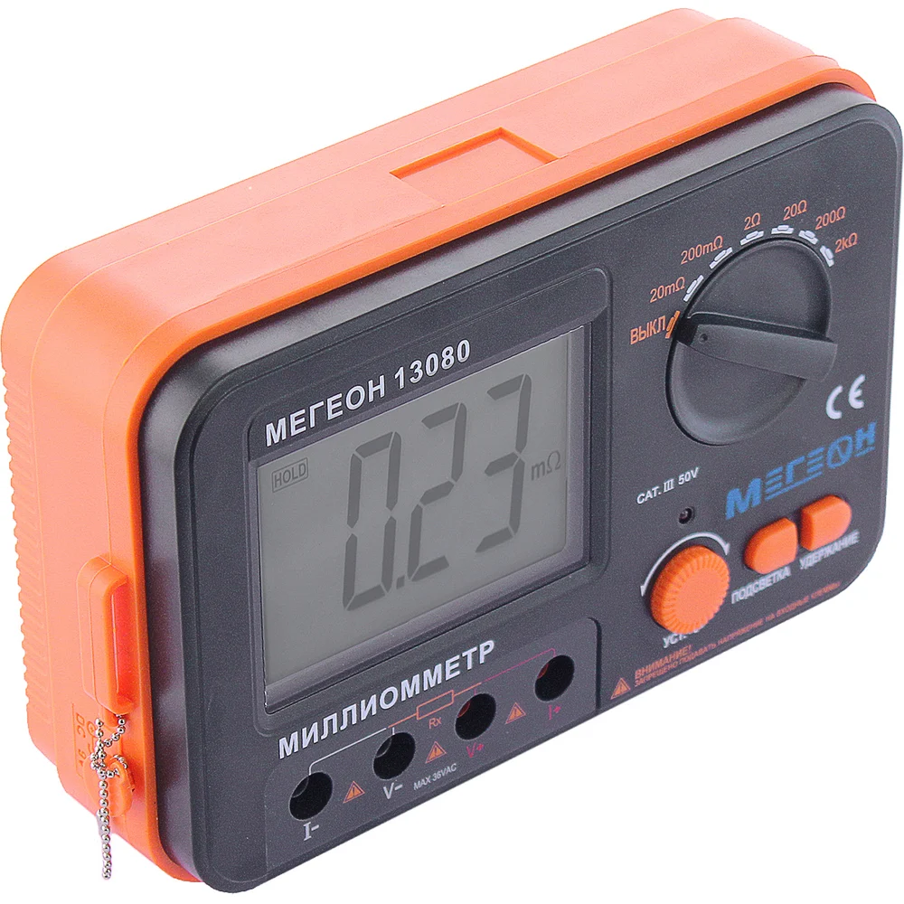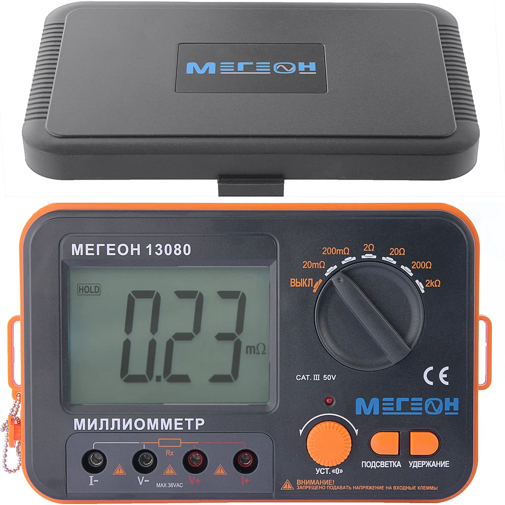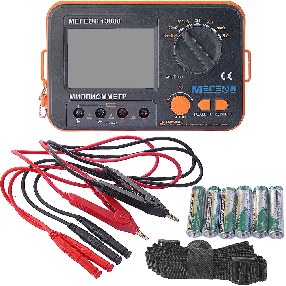 Комплектация Цифровой миллиомметр МЕГЕОН 13080 - 1 шт; 4-х проводной диагностический вывод - 1 пара; Наплечный ремень - 1 шт; Руководство по эксплуатации - 1 экз