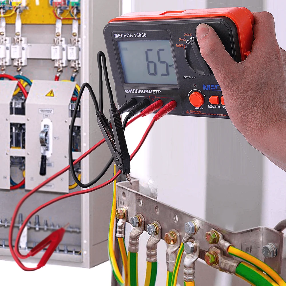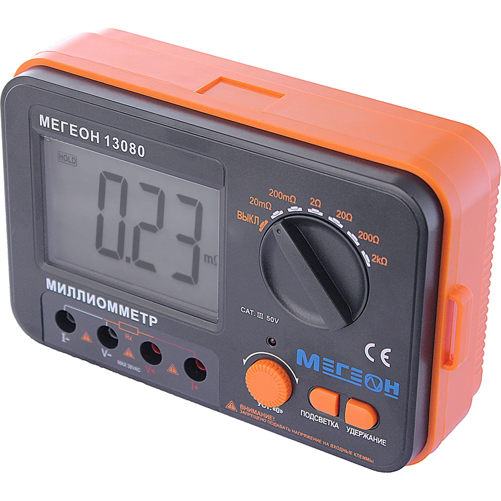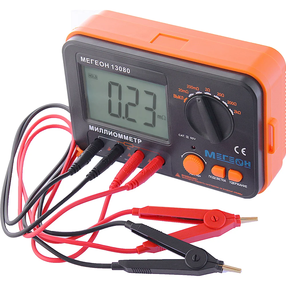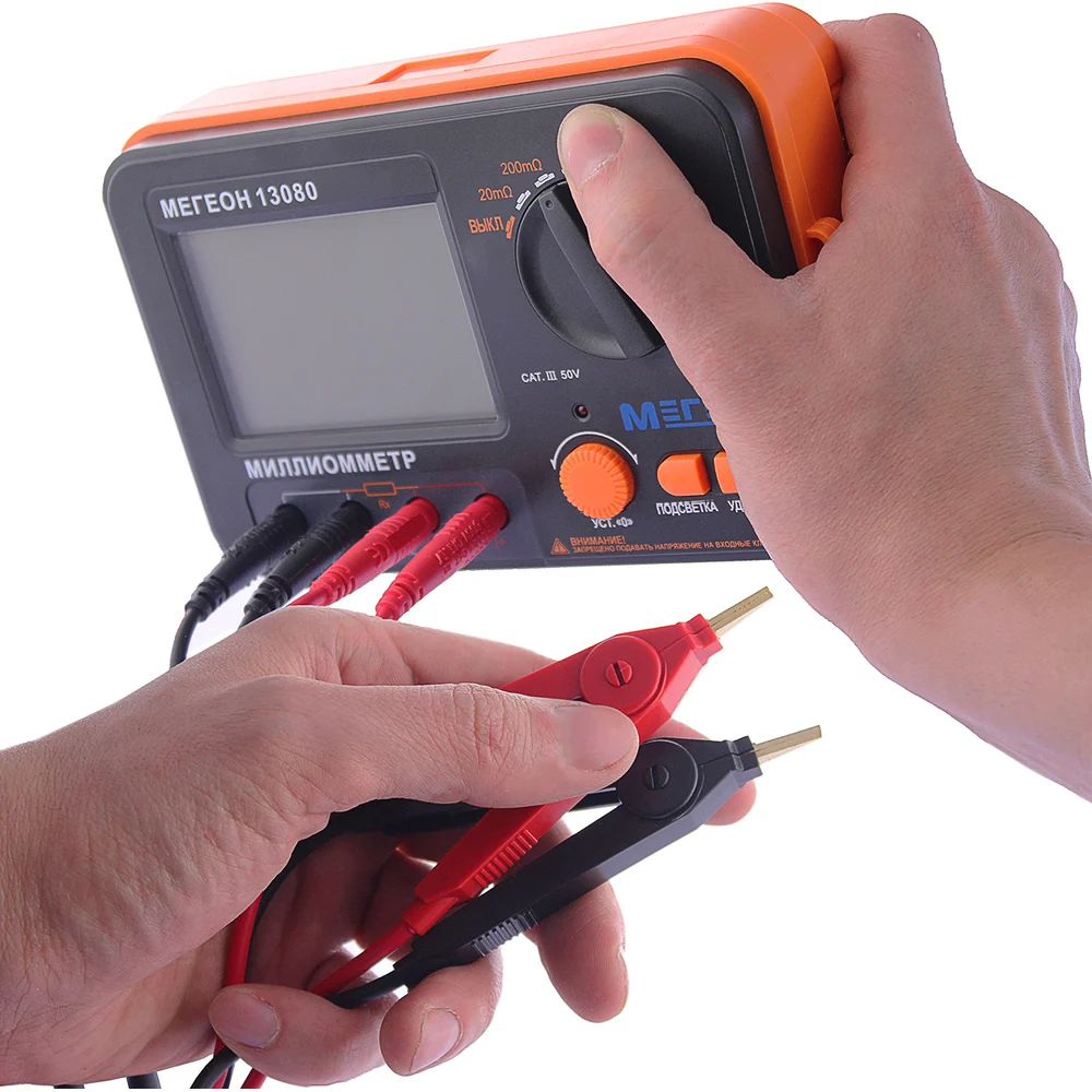 Комплектация Цифровой миллиомметр МЕГЕОН 13080 - 1 шт; 4-х проводной диагностический вывод - 1 пара; Наплечный ремень - 1 шт; Руководство по эксплуатации - 1 экз