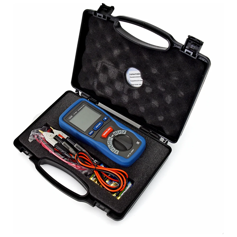 Комплектация Прибор; Измерительные щупы (1-контактные, 2 штуки); Измерительные щупы с зажимами типа "крокодил" (2-контактные, 2 штуки); Батареи (6хАА, 1.5 В); Руководство по экплуатации; Чемодан