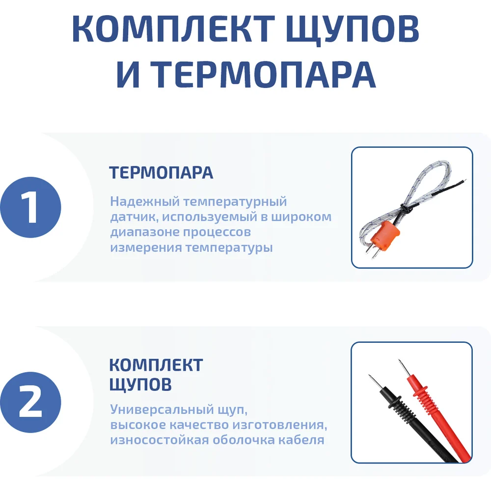Комплектация Мультиметр МЕГЕОН MY64 - 1 шт; Комплект щупов - 1 комплект; Термопара К-типа - 1 шт; Колодка для проверки транзисторов - 1 шт; Руководство по эксплуатации – 1 экз