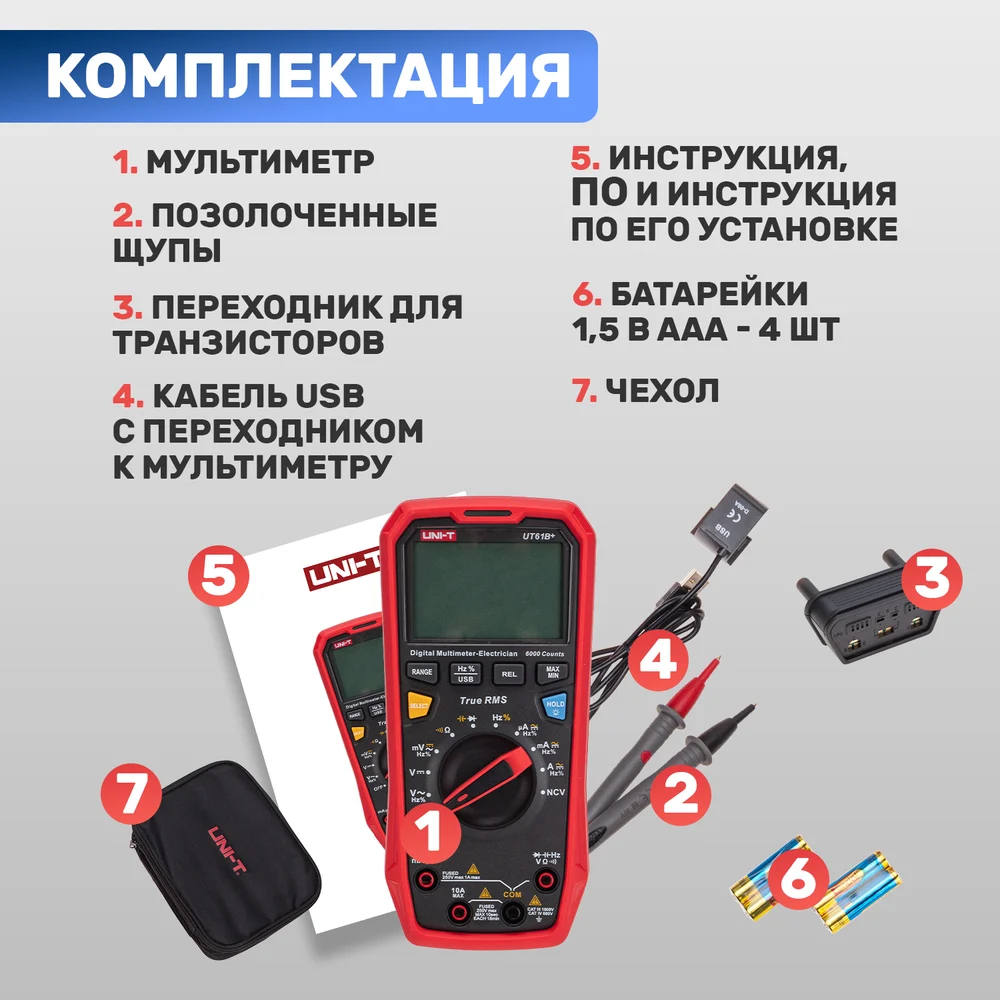 Комплектация Мультиметр; Позолоченные щупы; Переходник для транзисторов; Кабель USB с переходником к мультиметру; Батарея; Инструкция по эксплуатации