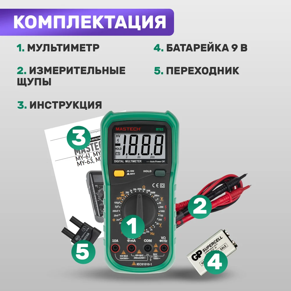 Комплектация 1 батарейка 9 В типа "Крона"; Комплект щупов; Инструкция на русском языке