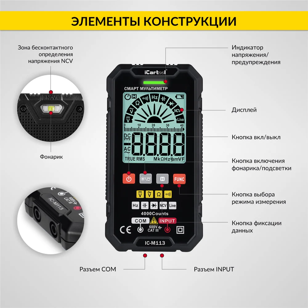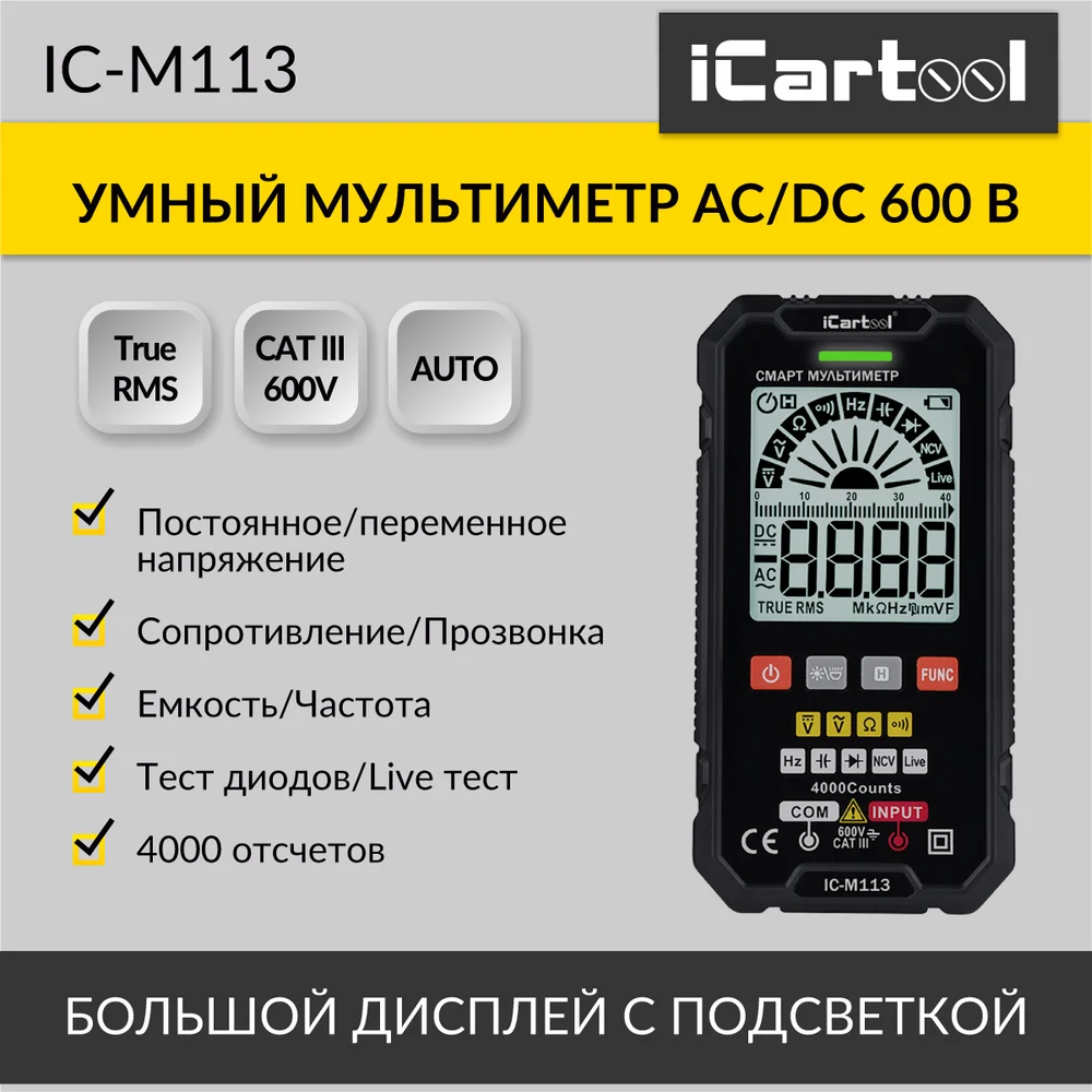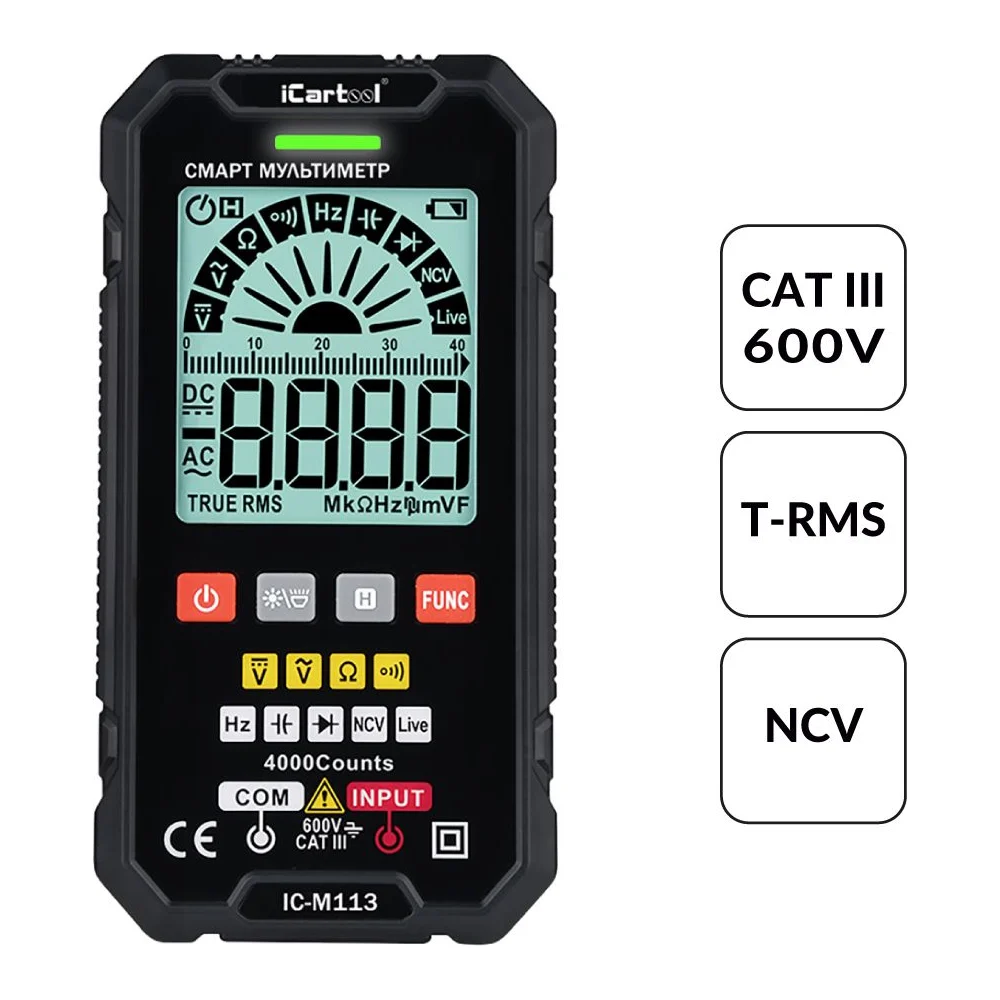 Купить Цифровой смарт-мультиметр iCarTool с подсветкой экрана CATIII 600V, TrueRMS IC-M113 по лучшей цене с доставкой - интернет магазин №1 в России