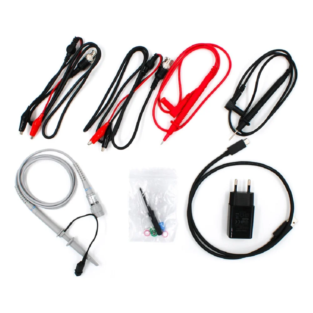 Комплектация Осциллограф-мультиметр; Адаптер питания; USB-кабель; Пассивный щуп; Кабель с зажимом-«крокодилом» (2 шт.); Набор щупов к мультиметру (один красный и один черный); Инструмент для регулировки щупов