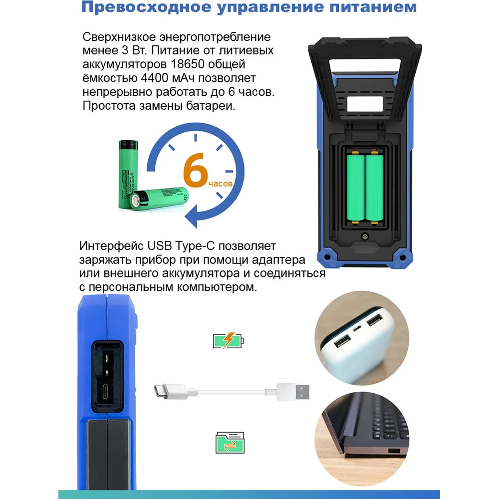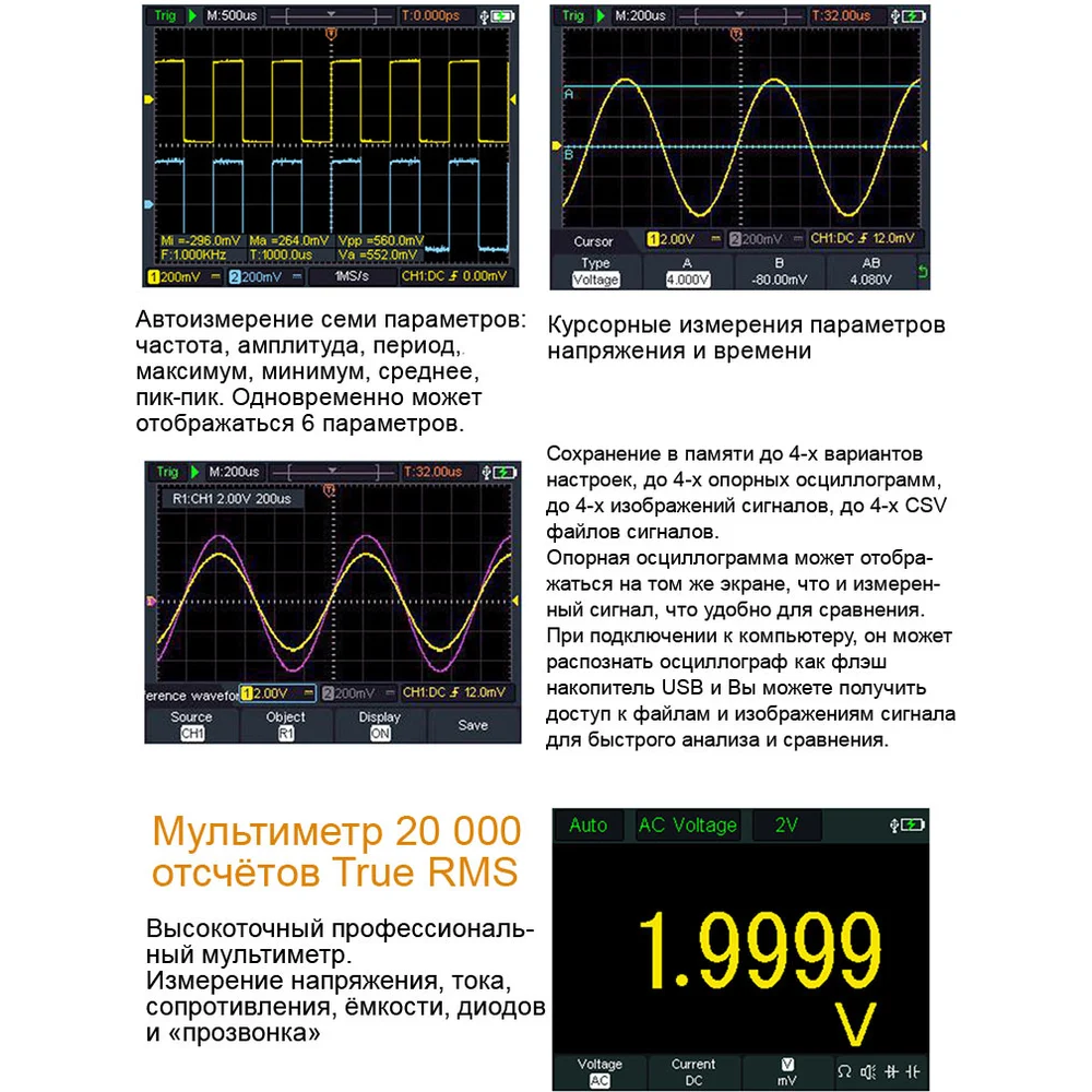 Комплектация Осциллограф,; аккумуляторы,; зарядное устройство,; USB-кабель Type-C для зарядки и подключению к ПК,; пассивный осциллографический пробник BNC,; пробник BNC – крокодилы,; щупы мультиметра,; регулировочная отвертка,; сумка чехол,; инструкция по эксплуатации