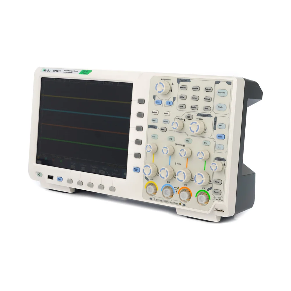 Цифровой осциллограф VERDO SB1802 , 4 канала 350 МГц, 8 бит, 5 Гвыб/c, 400 МБ, цв. сенсорный ЖКД 10,4", 800x600, 39 автоизмерений, цифровые фильтры, декодир I2C, SPI, CAN, RS232, мультиметр-регистратор, генератор 50 МГц, USB, LAN, Pass/Fall, VGA SB180200