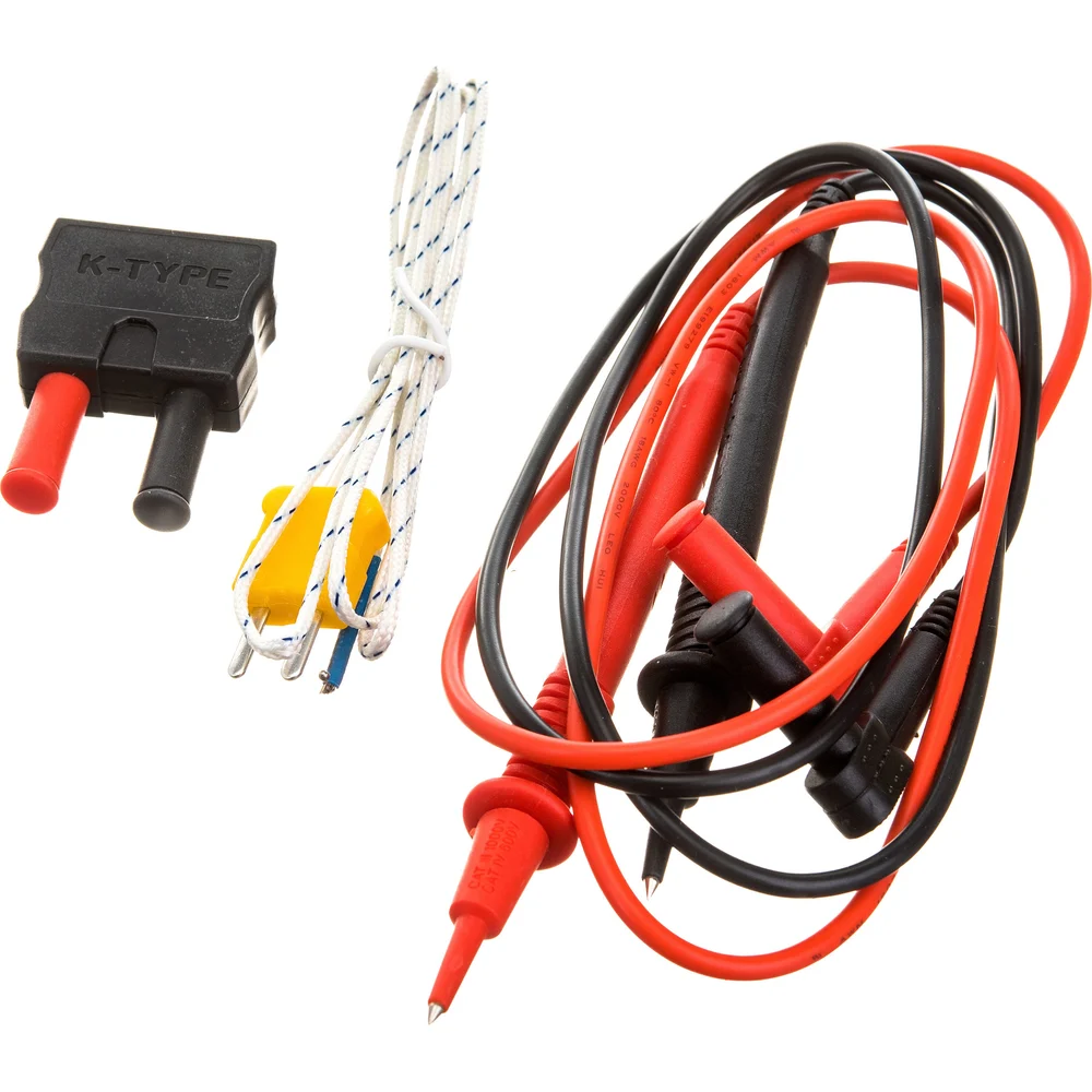 Комплектация Прибор; Измерительные щупы; 2 батарейки ААА; Термопара типа К; Руководство по эксплуатации; Чехол