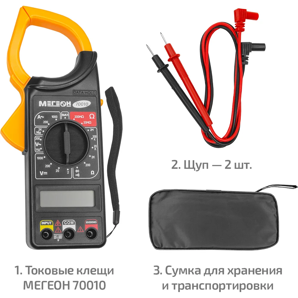 Комплектация 1. Токовые клещи МЕГЕОН 70010- 1 шт; 2. Сумка для хранения и транспортировки - 1 шт; 3. Щуп- 2 шт; 4. Руководство по эксплуатации – 1 экз