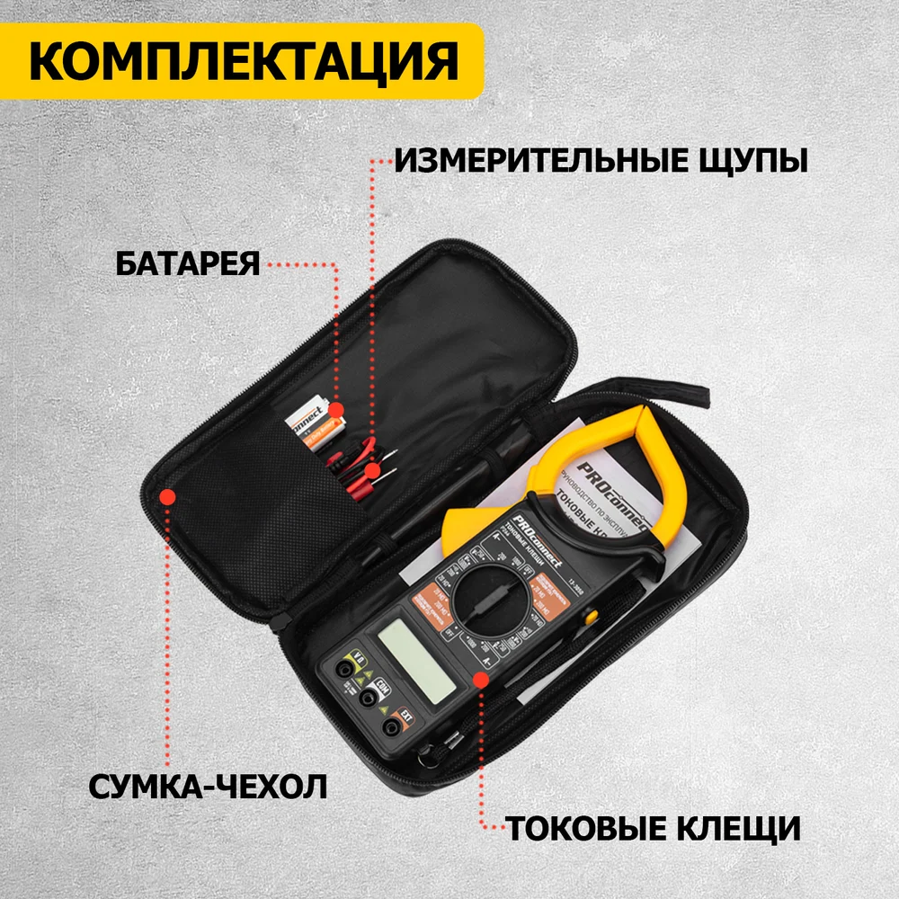 Комплектация Токовые клещи; Щупы; Батарейка; Инструкция; Чехол