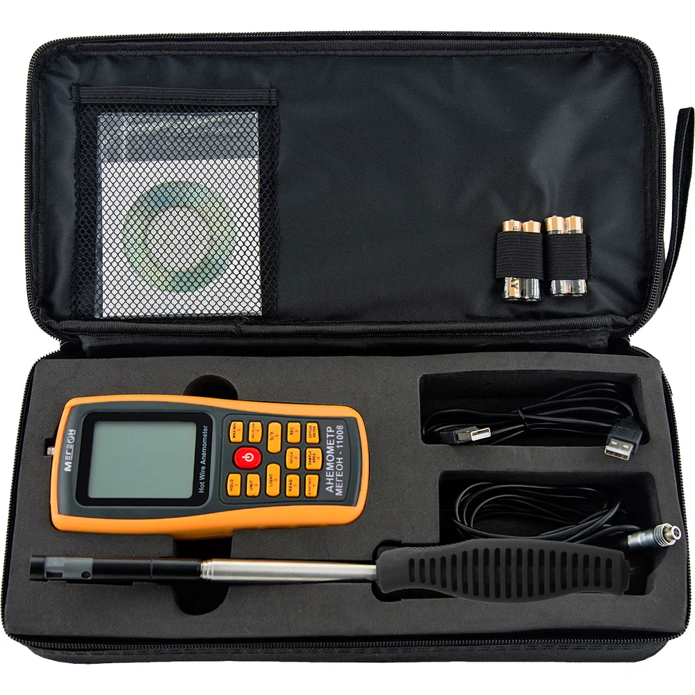 Комплектация 1. Анемометр МЕГЕОН 11008 - 1 шт; 2. Выносной зонд в сборе - 1 шт; 3. Защитный холдер - 1 шт; 4. Сумка для переноски и хранения - 1 шт; 5. Кабель- USB - 1 шт; 6. Руководство по эксплуатации - 1 экз; Батарейки в комплект не входят!