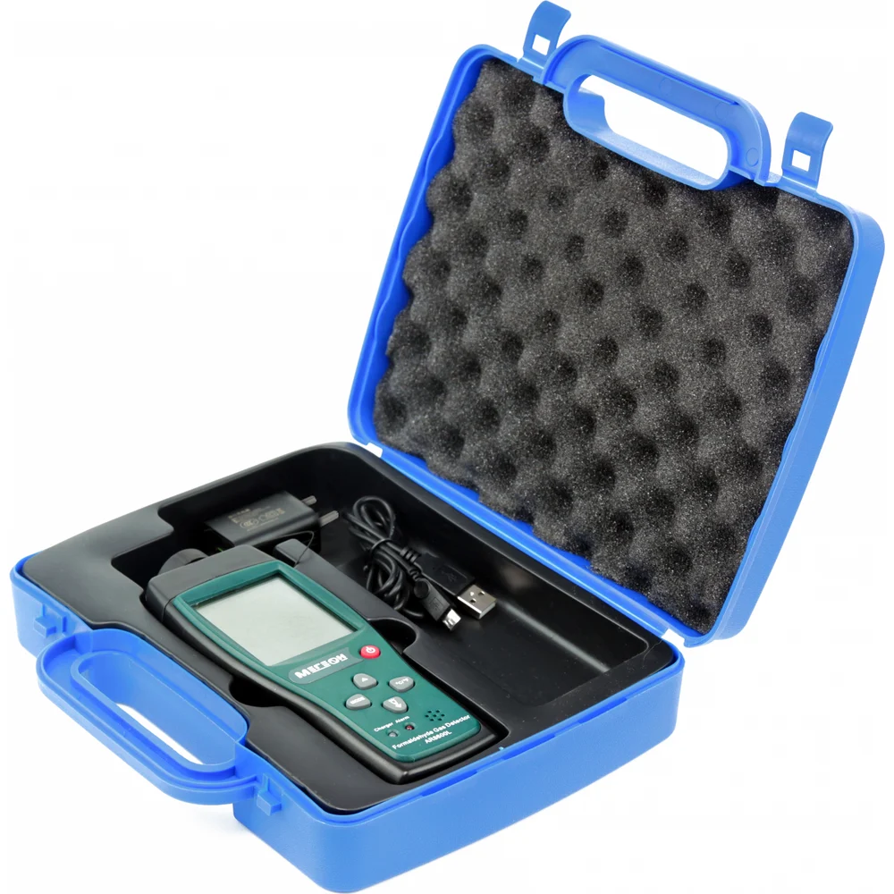 Комплектация Анализатор формальдегида; Аккумулятор литиевый 1000 мАч; Защитный колпачок датчика; Зарядное устройство 5 В 1.0 А; Руководство по эксплуатации; Гарантийный талон; Пластиковый кейс для хранения и транспортировки