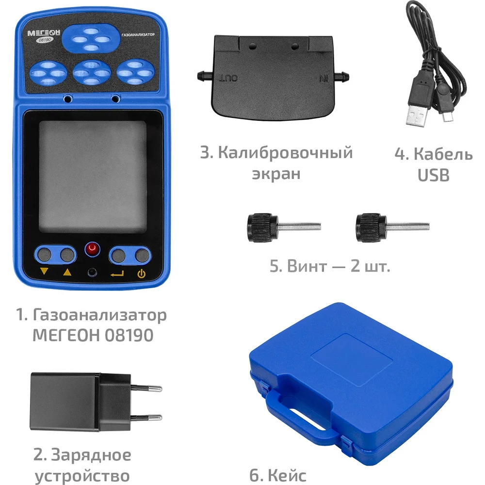 Комплектация Газоанализатор МЕГЕОН 08190 - 1 шт; Калибровочный экран - 1 шт; Винт - 2 шт; Кабель USB - 1 шт; Кейс для хранения и транспортировки - 1 шт; Руководство по эксплуатации - 1 экз
