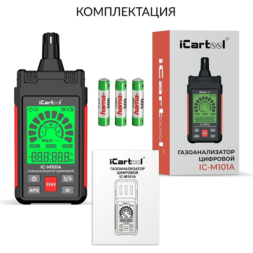 Комплектация Газоанализатор; Батарейки 1,5В ААА - 3 шт; Инструкция по эксплуатации; Упаковка (картонная коробка)
