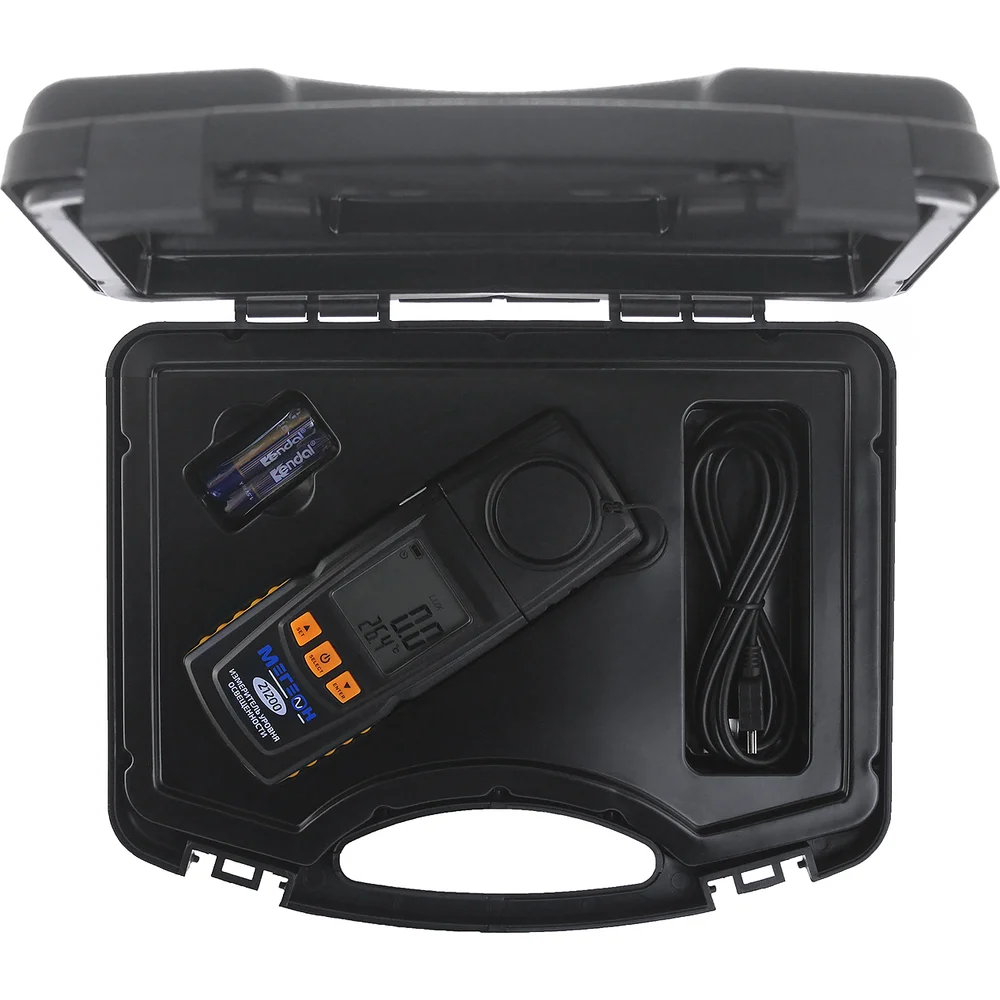 Комплектация Люксметр МЕГЕОН 21200 - 1 шт; Кейс для транспортировки и хранения - 1 шт; Кабель для соединения с ПК - 1 шт; Диск с ПО - 1 шт; Руководство по эксплуатации - 1 экз