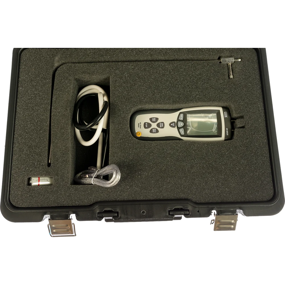 Комплектация Прибор; Металлический щуп; Гибкий шланг (2 штуки); Батарея типа "Крона"; Диск CD-ROM с ПО; Кабель USB; Руководство по эксплуатации; Пластиковый кейс