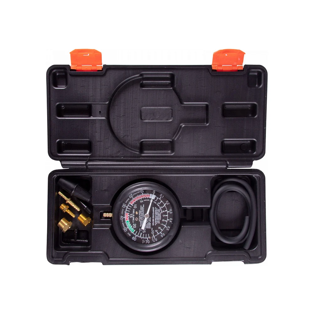 Комплектация Манометр 90 мм с крюком для подвеса; Шланг 750 мм сечением 4×8 мм; Адаптеры свечные М14 и М18; Адаптер М10 × ёлочка 5.5 мм; Адаптер ёлочка/ёлочка 5.5/7.5 мм; Тройник ёлочка 7.5×7.5×7.5 мм; Адаптер конус 9.5×4 мм пластиковый; Адаптер конус/конус 6×14 мм/8×16 мм; Кейс