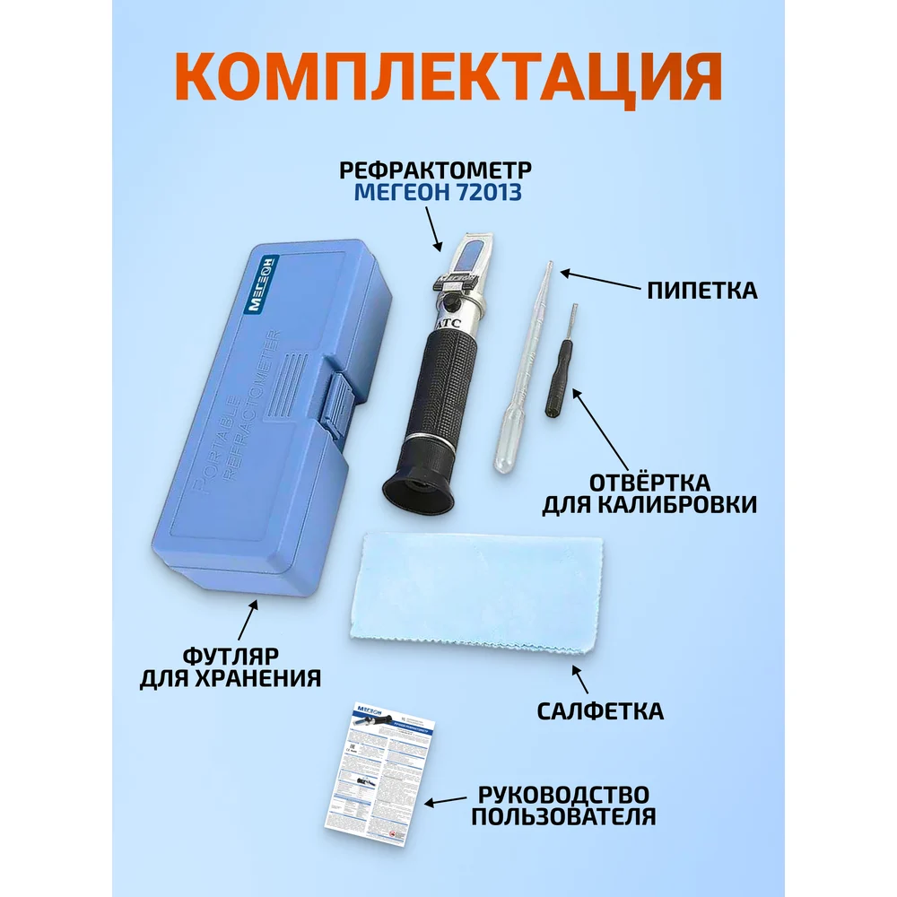 Комплектация Рефрактометр МЕГЕОН 72013 - 1 шт; Отвёртка для калибровки - 1 шт; Салфетка - 1шт; Пипетка - 1 шт; Футляр для переноски и хранения - 1 шт; Руководство по эксплуатации - 1 экз
