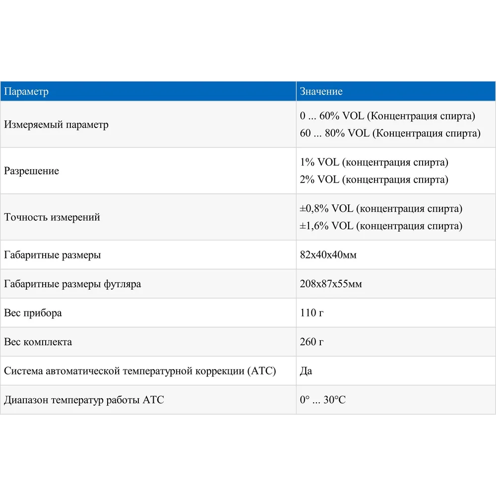 Точность ±0,8% VOL (концентрация спирта) ±1,6% VOL (концентрация спирта)
