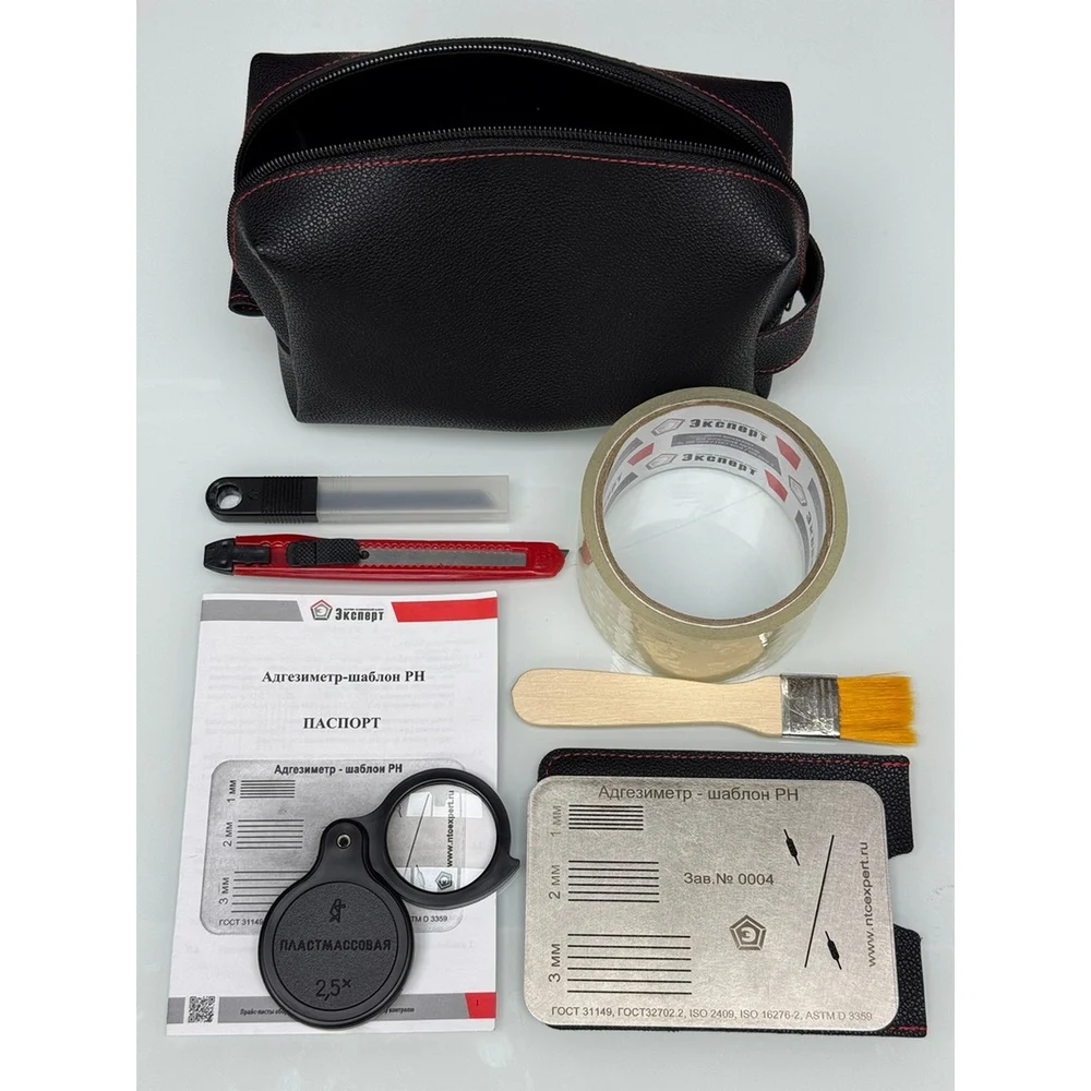 Комплектация адгезивная лента,; Адгезиметр-решетка «Эксперт-АР»,; лупа х2,5,; канцелярский нож,; 10 запасных лезвий,; кисточка,; паспорт,; кейс