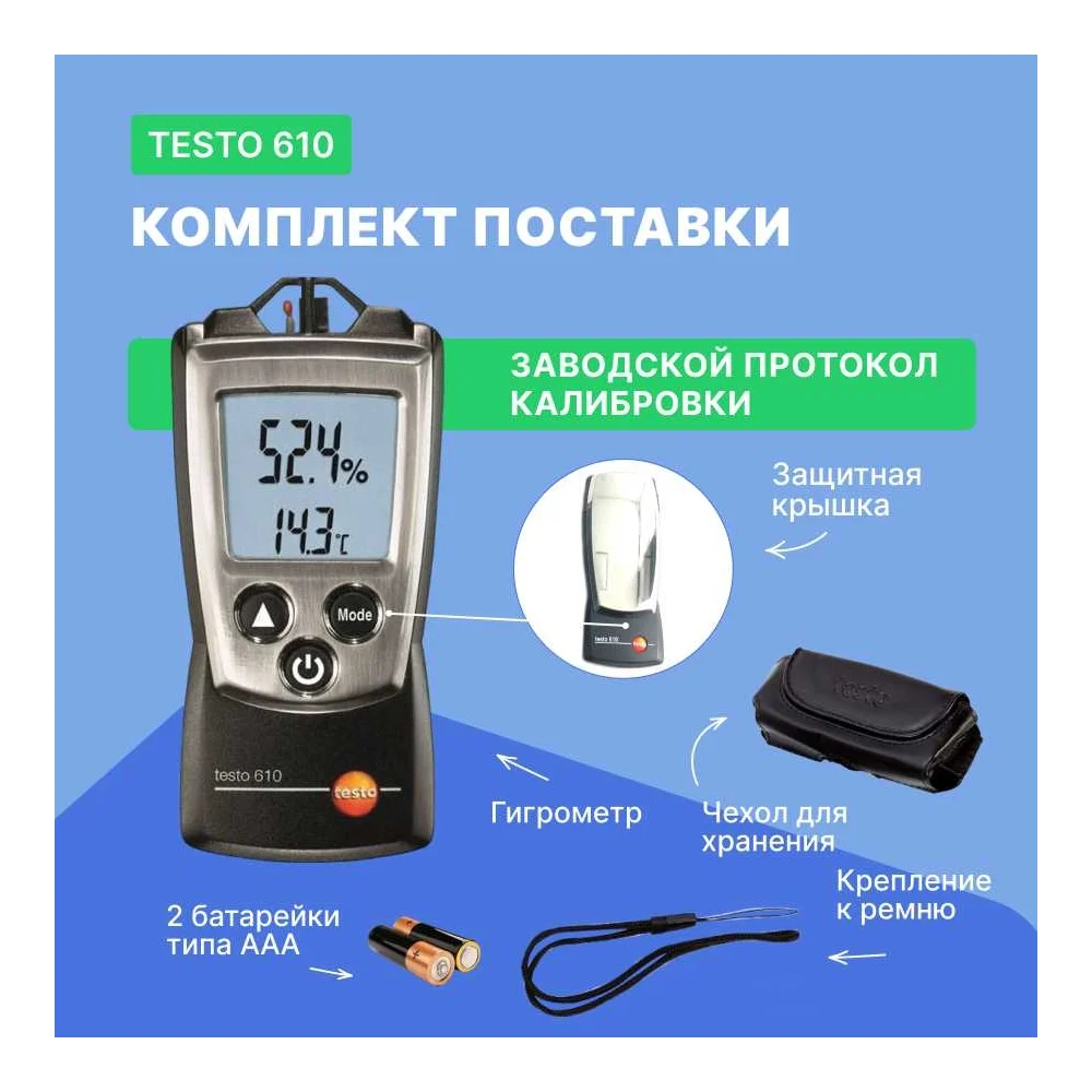 Комплектация Карманный термогигрометр testo 610; Защитная крышка; Батарейка; Заводской протокол калибровки