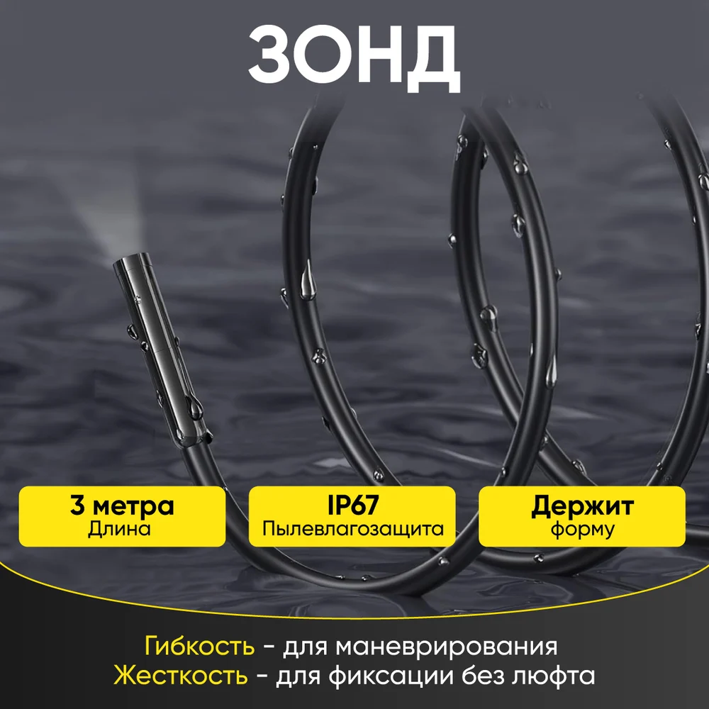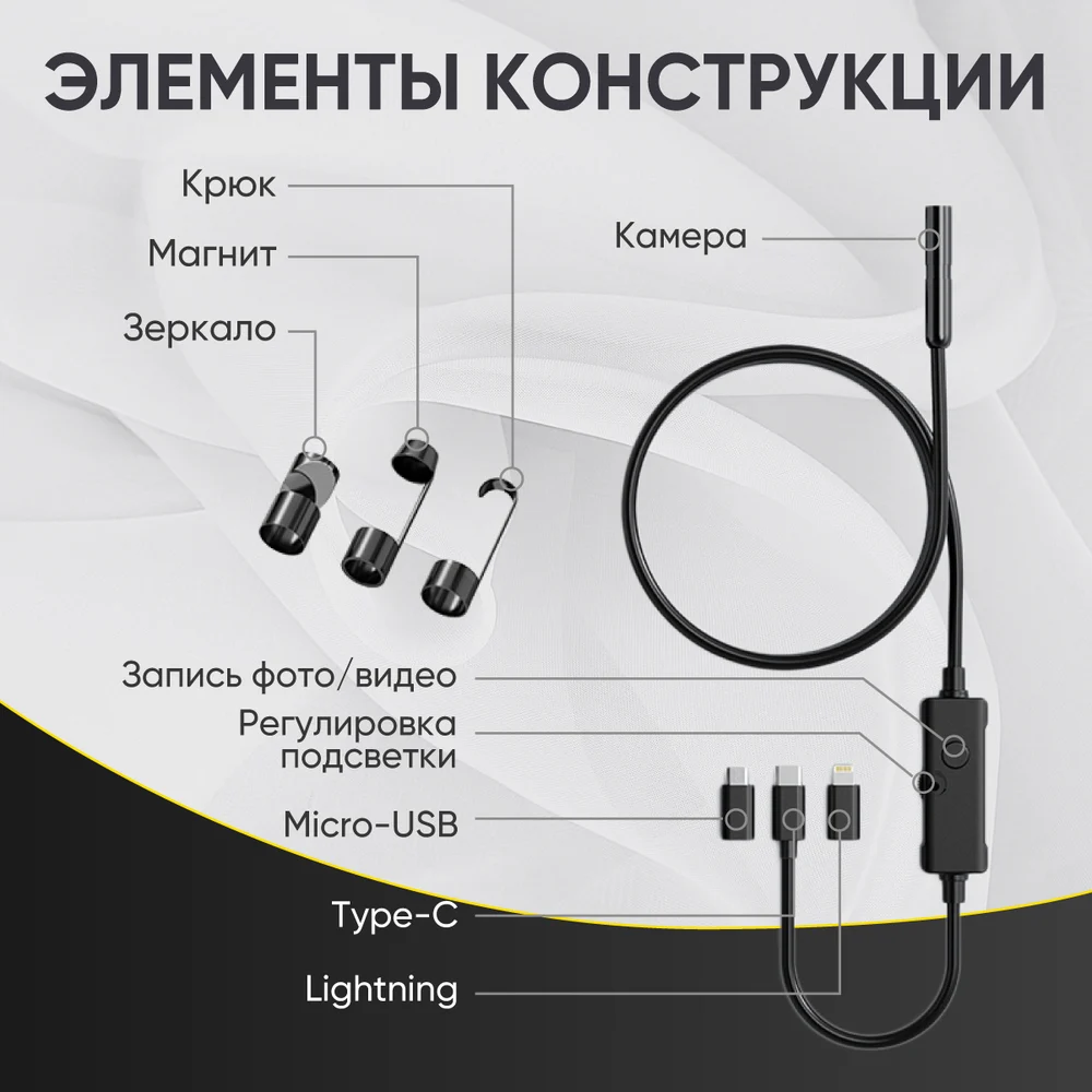 Комплектация Видеоэндоскоп с зондом; Крюк; Магнит; Насадка-переходник Micro-USB; Насадка-переходник Lightning; Картонная упаковка; Электронная инструкциям