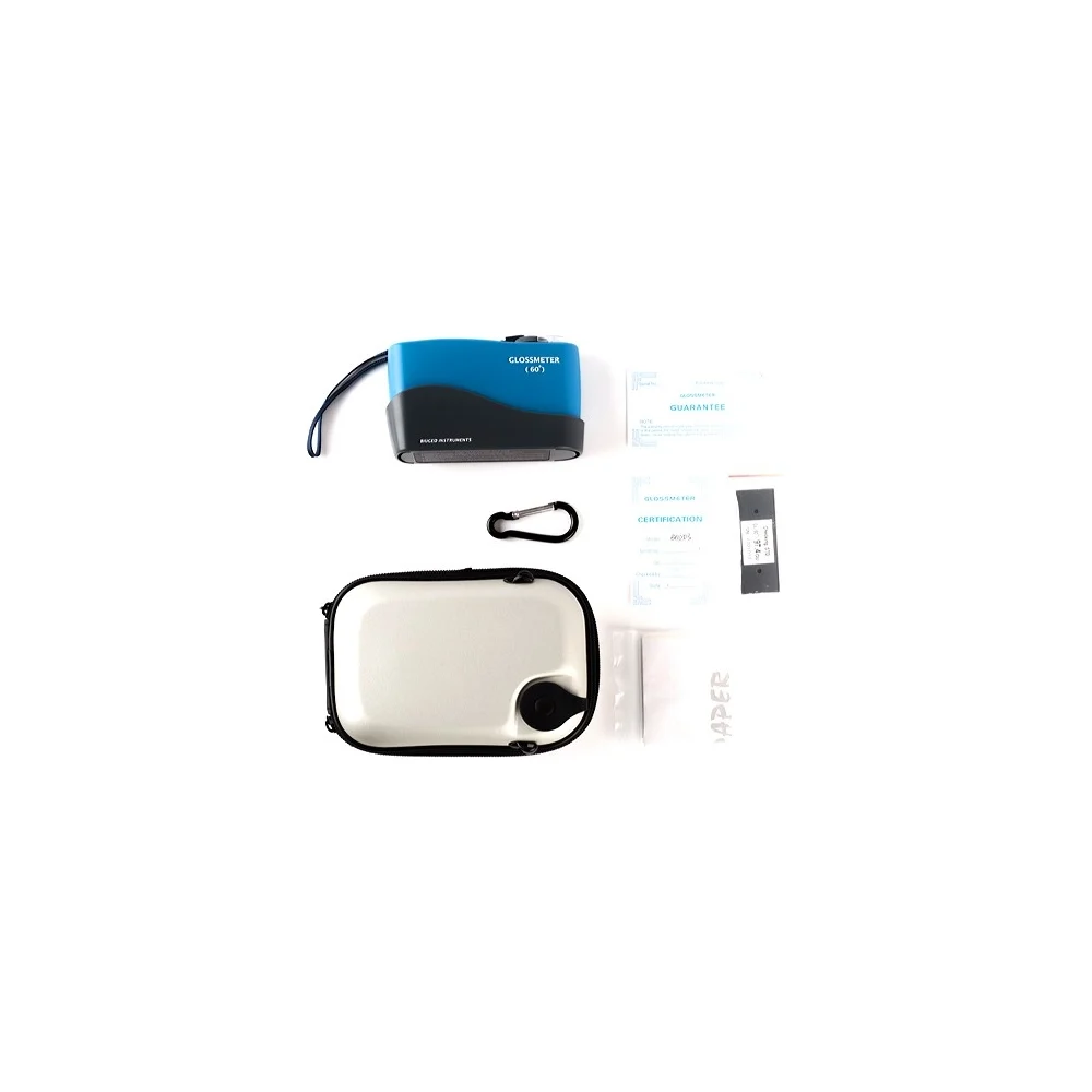 Комплектация Блескомер; Защитный футляр; Калибровочная пластина с указанным значением блеска (GU); Безворсовая салфетка; Сертификат калибровки завода изготовителя; Инструкция по эксплуатации; Упаковка