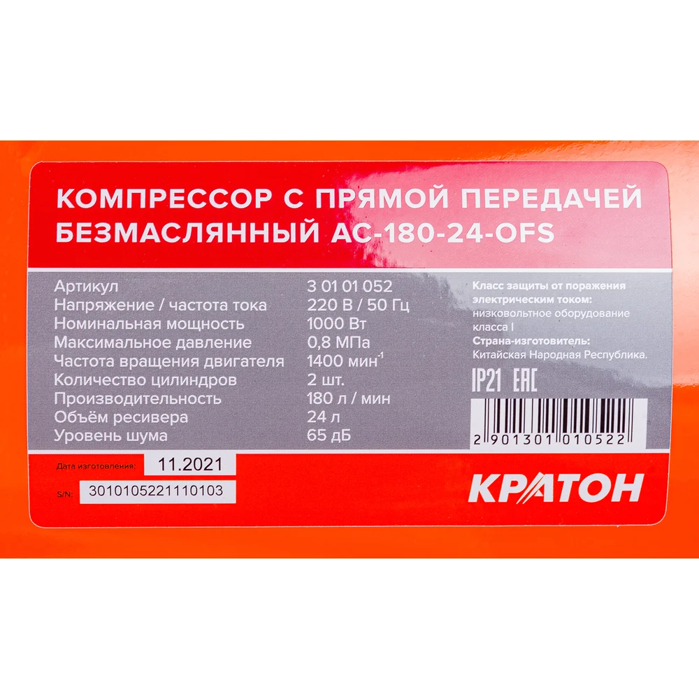 Купить Безмасляный компрессор с прямой передачей Кратон AC-180-24-OFS 3 01 01 052 по лучшей цене с доставкой - интернет магазин №1 в России