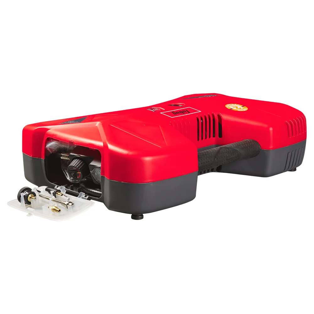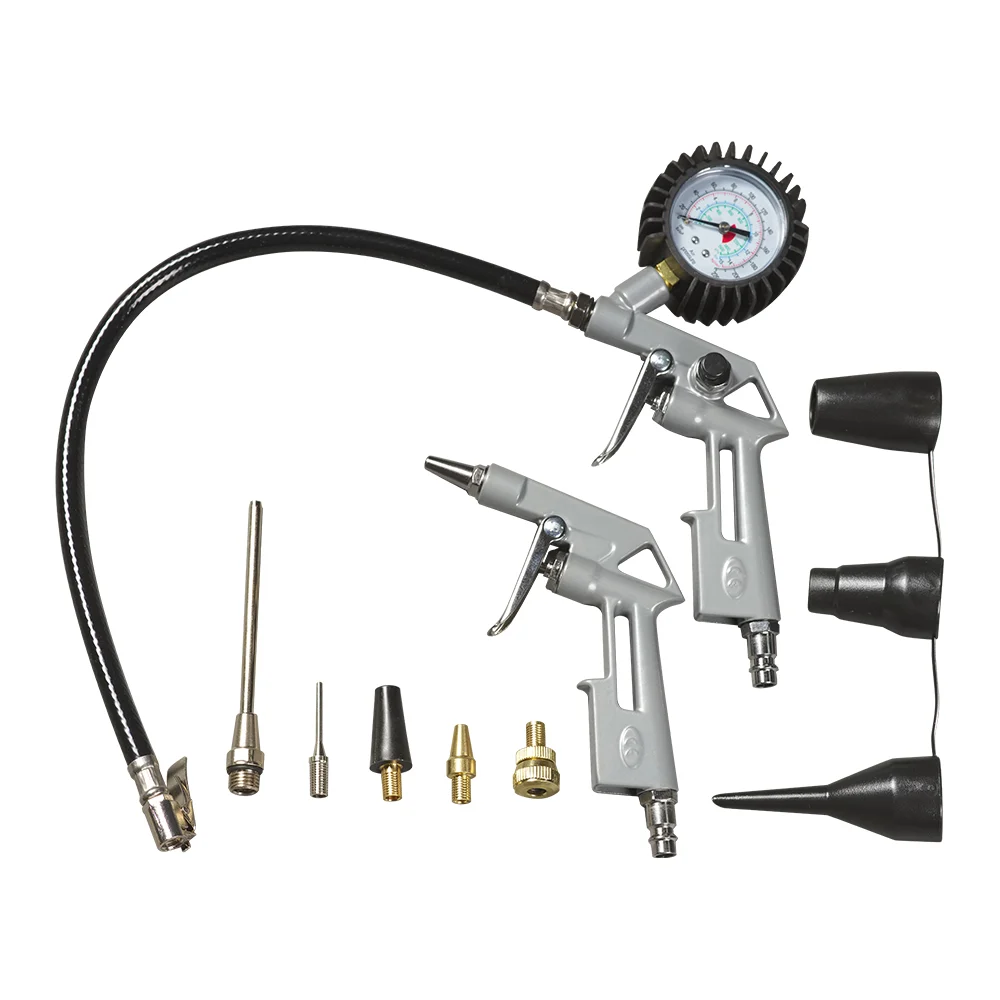 Комплектация Компрессор; Воздушный шланг, 3 м; Пневмопистолет с манометром для накачки; Пневмопистолет для продувки; Удлиненная насадка для продувки; Игла для накачки мячей; Универсальный адаптер для клапанов с внутренним диаметром 6 мм; Универсальный адаптер для клапанов с внутренним диаметром 9 мм; Адаптер для накачки велосипедных шин; Насадки для накачки лодок, матрасов, бассейнов; Переходник (для насадок накачки лодок, матрасов, бассейнов)