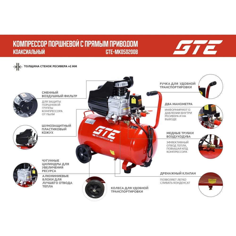 Купить Компрессор поршневой с прямым приводом GTE 220В, ресив. 50л, 200л/мин. -MK050200B GTE-MK050200B по лучшей цене с доставкой - интернет магазин №1 в России