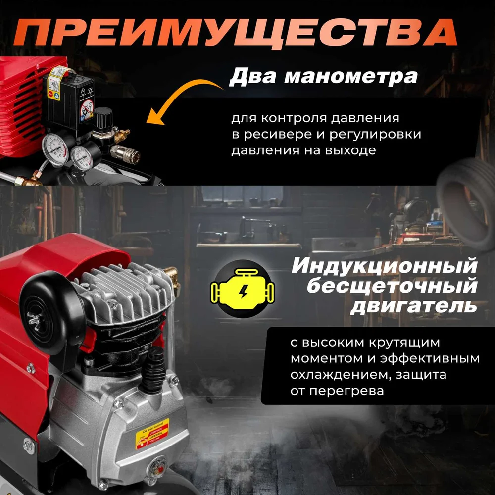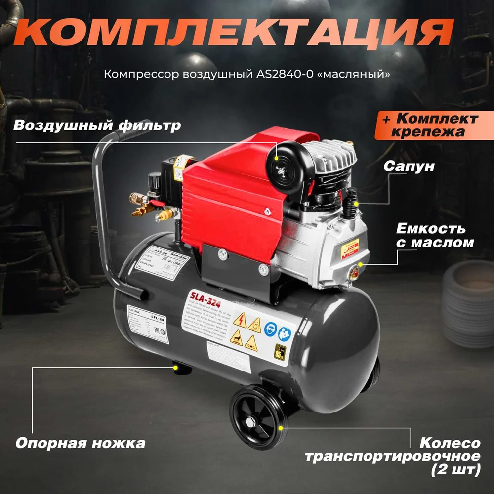 Комплектация Компрессор; Фильтр воздушный; Колесо транспортировочное - 2 шт; Опорная ножка; Комплект крепежа; Ёмкость с маслом; Сапун; Руководство по эксплуатации; Коробка