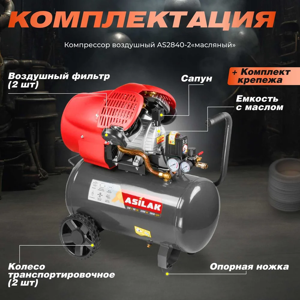 Комплектация Компрессор; Фильтр воздушный - 2 шт; Колесо транспортировочное - 2 шт; Опорная ножка; Комплект крепежа; Ёмкость с маслом; Сапун; Руководство по эксплуатации; Коробка