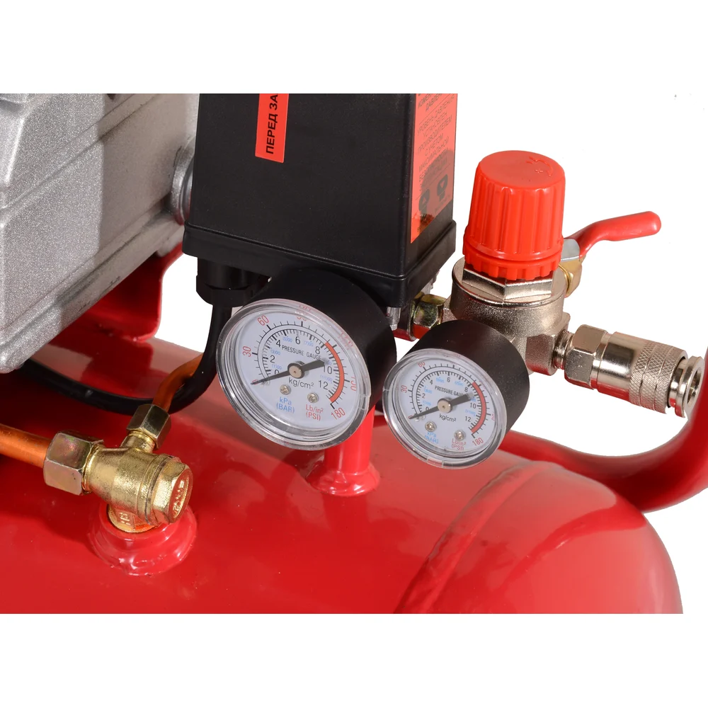 Комплектация Колеса 2 шт; Резиновая подножка 2 шт; Сапун; Смазочное масло для компрессоров (250 мл); Воздушный фильтр в корпусе; Руководство по эксплуатации; Комплект крепежа