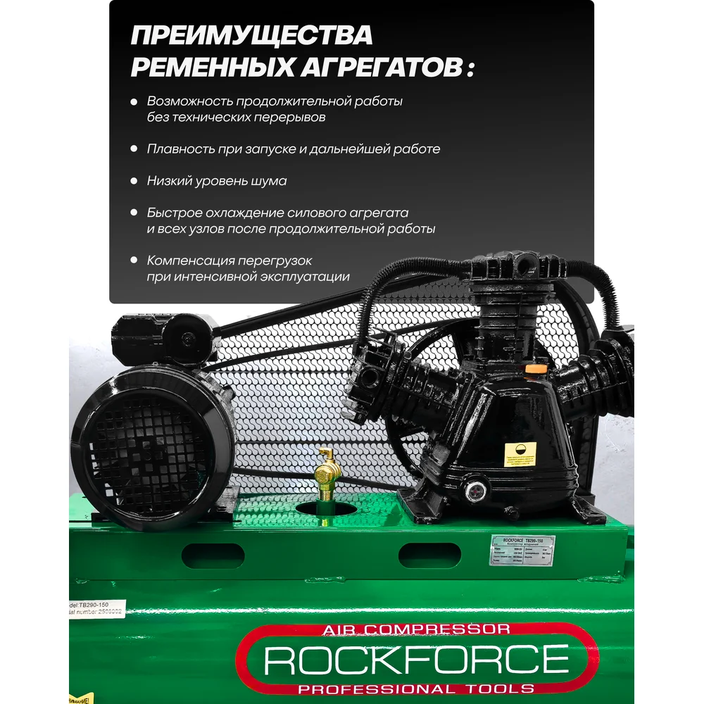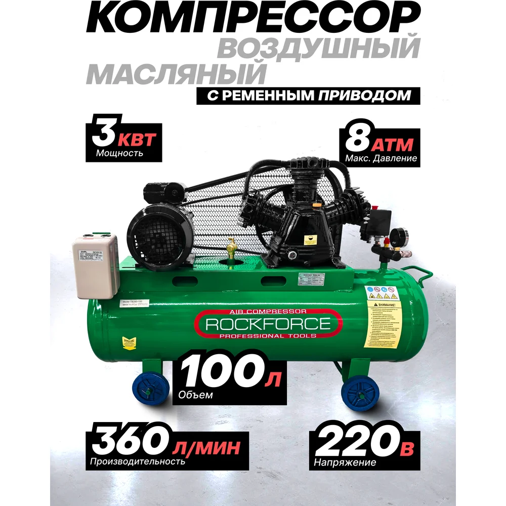 Купить Компрессор 3-х поршневой Rockforce с ременным приводом (3.0кВт, ресивер 100л, 360л/м, 220В) RF-TB290-150/220V/(62485) по лучшей цене с доставкой - интернет магазин №1 в России