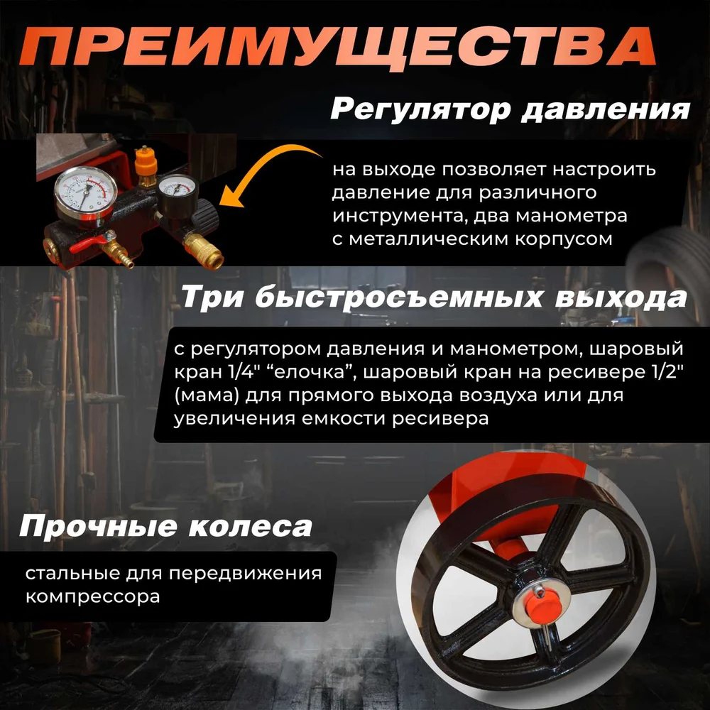 Комплектация Компрессор; Фильтр воздушный - 3 шт; Колесо транспортировочное - 4 шт; Комплект крепежа; Инструкция; Упаковка