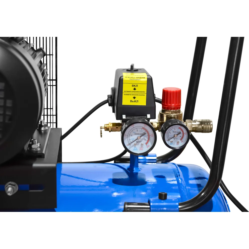 Комплектация Компрессорная головка с 2 цилиндрами, установленная на 100-л ресивере; Электродвигатель 1Ф.х230 В с фазосдвигающим конденсатором; Сетевой кабель 1.5 м с евровилкой; Автоматический прессостат с кнопкой включения; Воздушный редуктор с двумя манометрами; Выходная воздушная муфта БРС; Клапан аварийного сброса давления; Решётчатый защитный кожух приводного ремня; Воздушный фильтр; Двухколесное шасси и опорная стойка