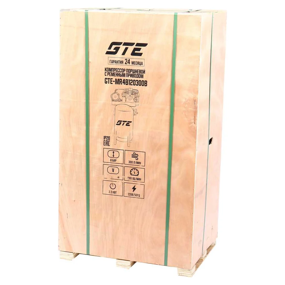 Комплектация Компрессор вертикальный поршневой с ременным приводом 220В, ресив. 120л, 300л/мин. GTE-MR4B120300B; Транспортировочные колеса - 2 шт; Кабель питания; Инструкция по эксплуатации на русском языке