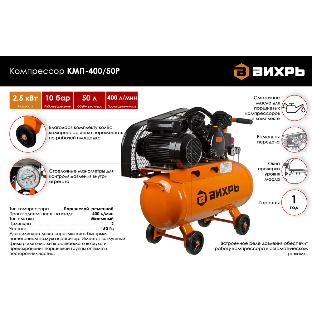 Купить Компрессор Вихрь КМП-400/50Р 74/3/10 по лучшей цене с доставкой - интернет магазин №1 в России