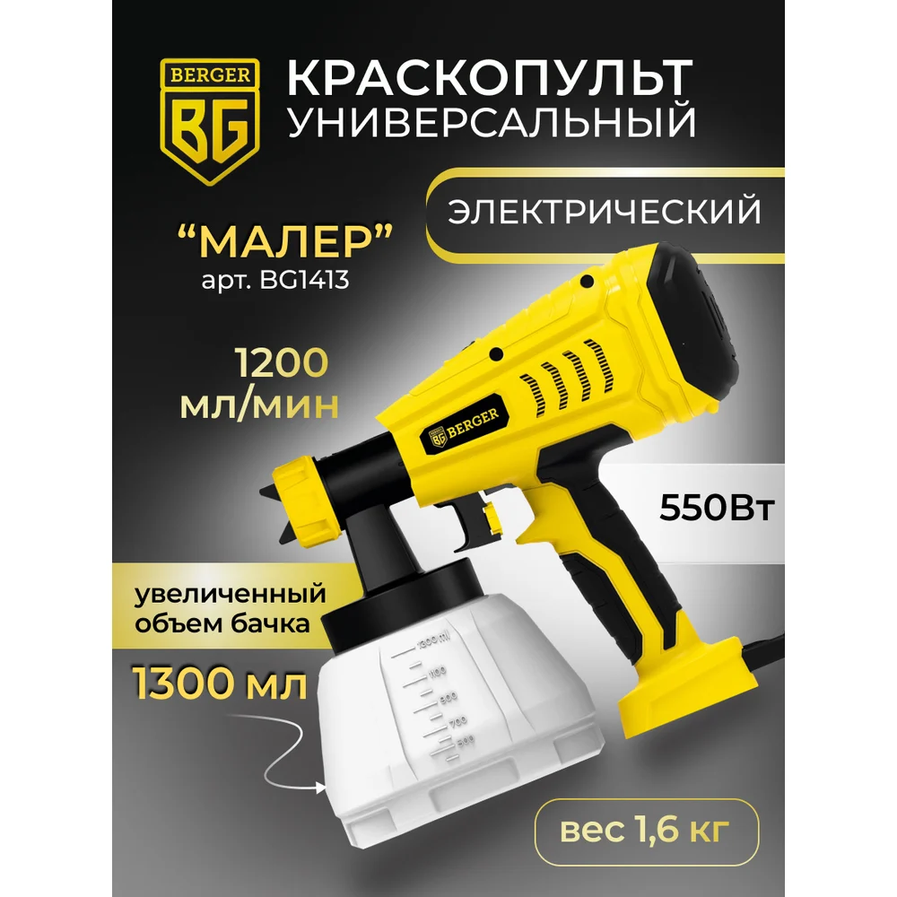 Купить Электрический универсальный краскопульт BERGER Малер 550 ВТ, 1.2 л/мин BG1413 по лучшей цене с доставкой - интернет магазин №1 в России