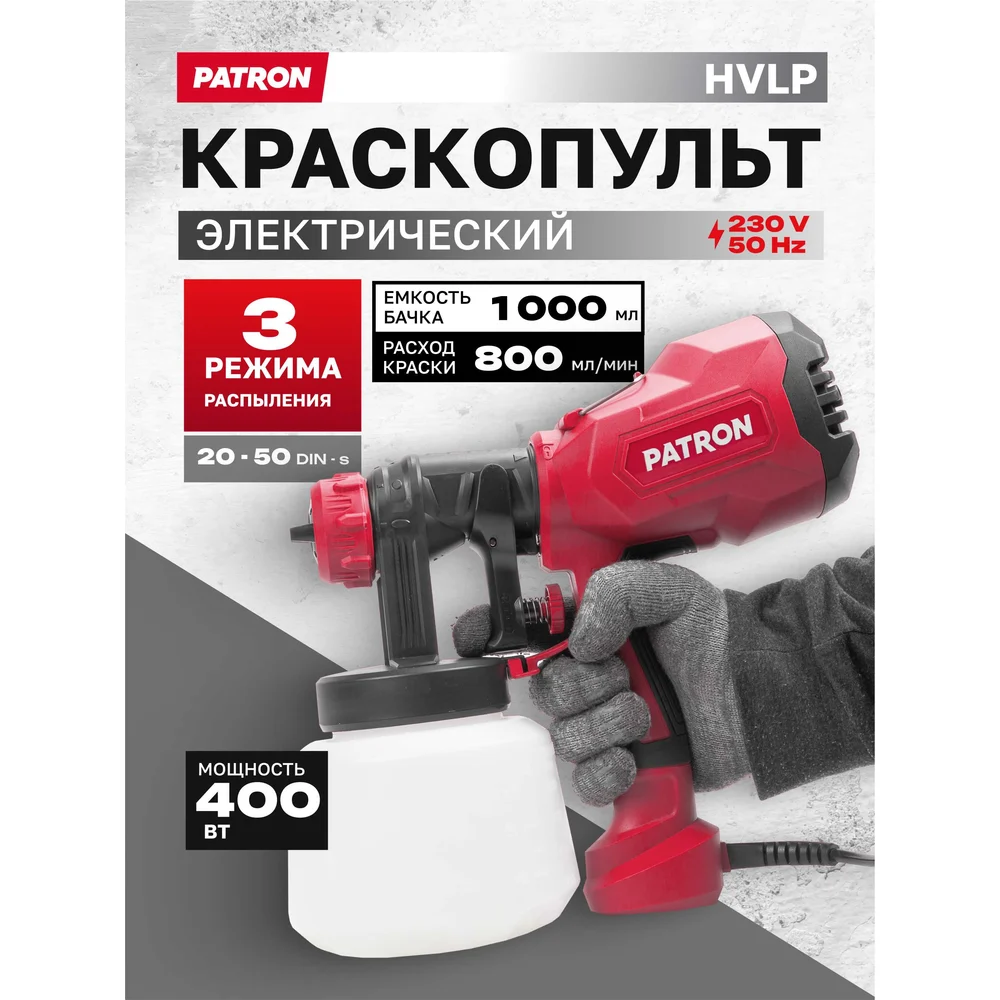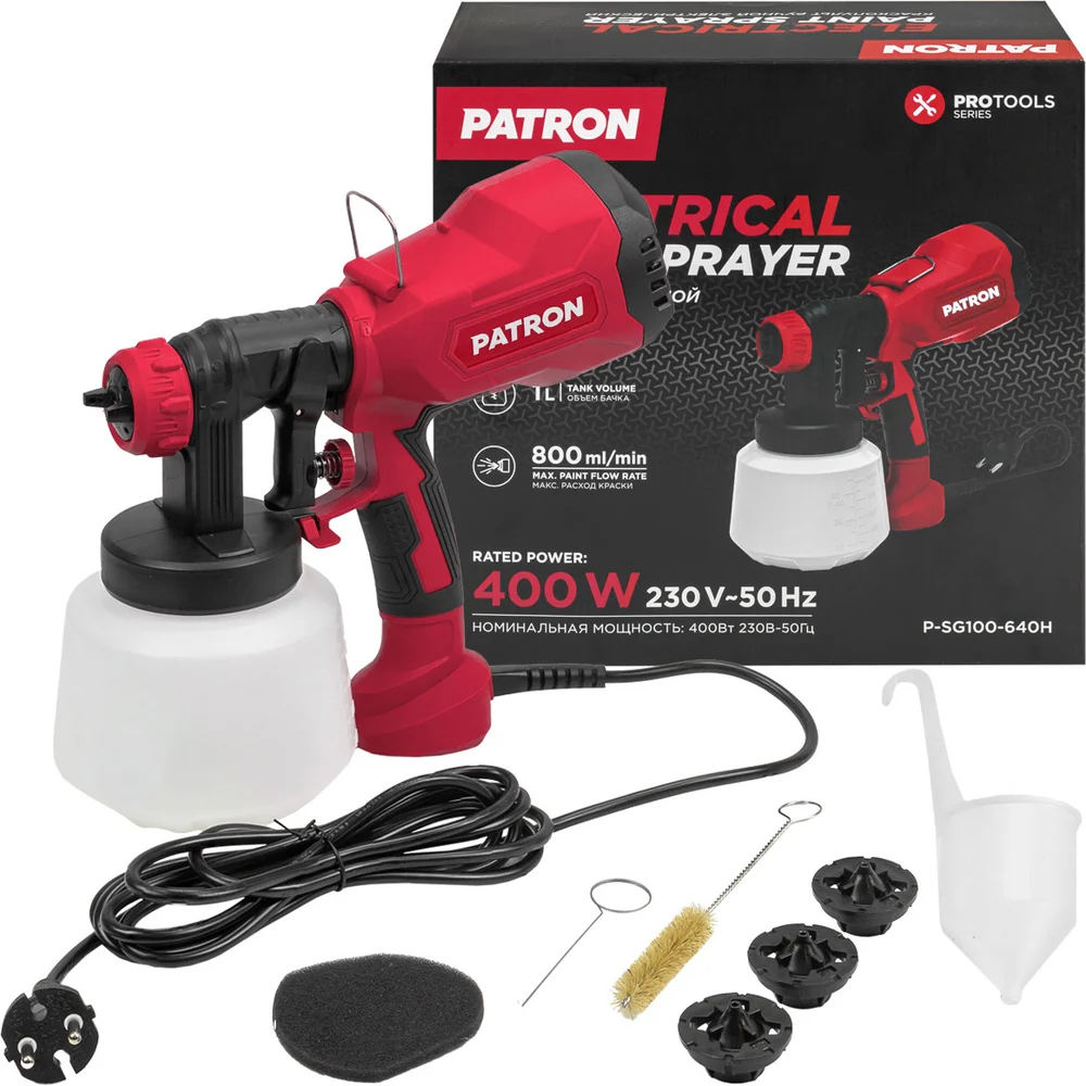 Купить Краскопульт ручной электрический PATRON (230В, 400Вт, объем бачка 1л, макс.расход краски 800мл/мин) P-SG100-640H(65061) по лучшей цене с доставкой - интернет магазин №1 в России
