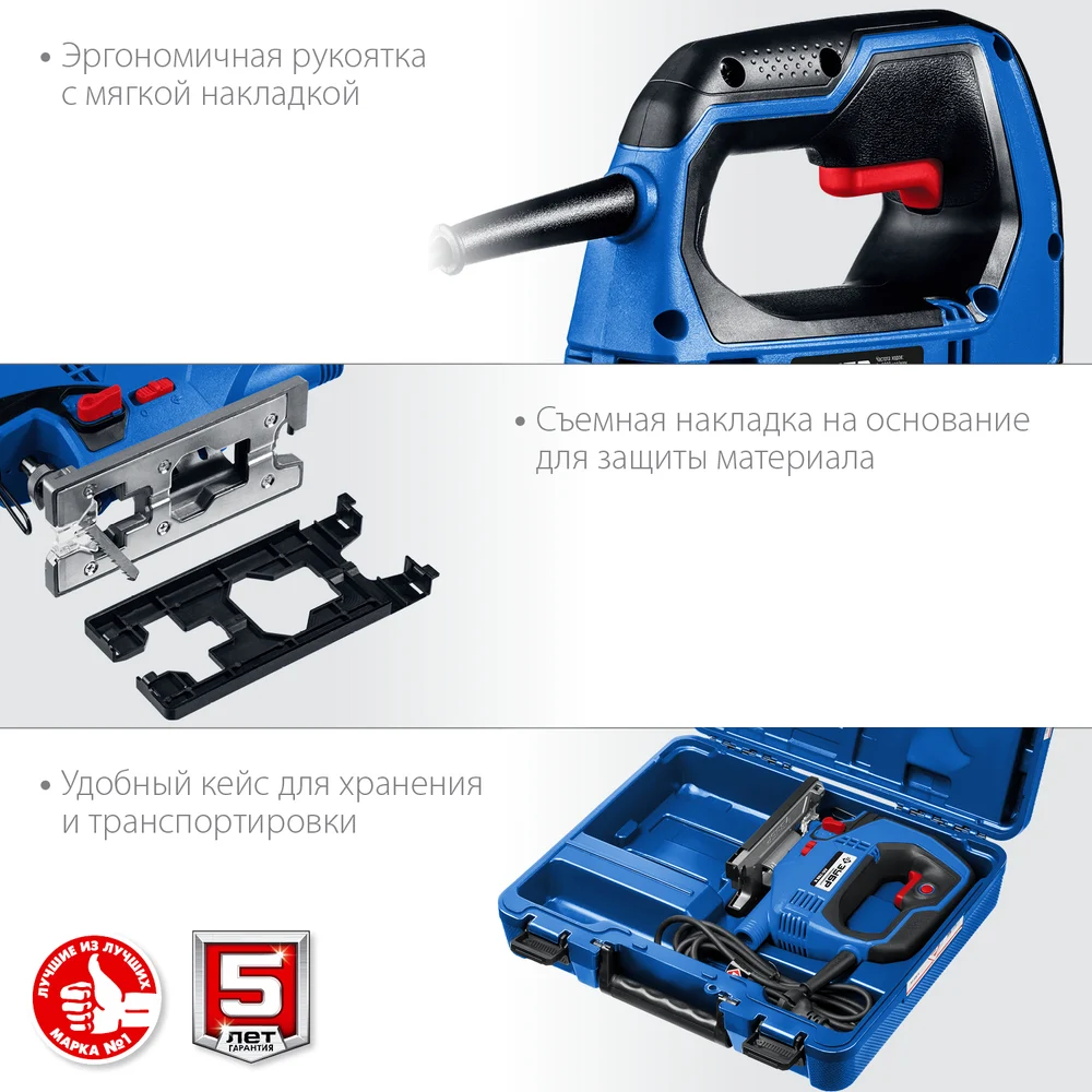 Комплектация Лобзик; Накладка на основание; Вставка для чистого пиления; Ключ имбусовый; Полотно; Руководство по эксплуатации; Кейс