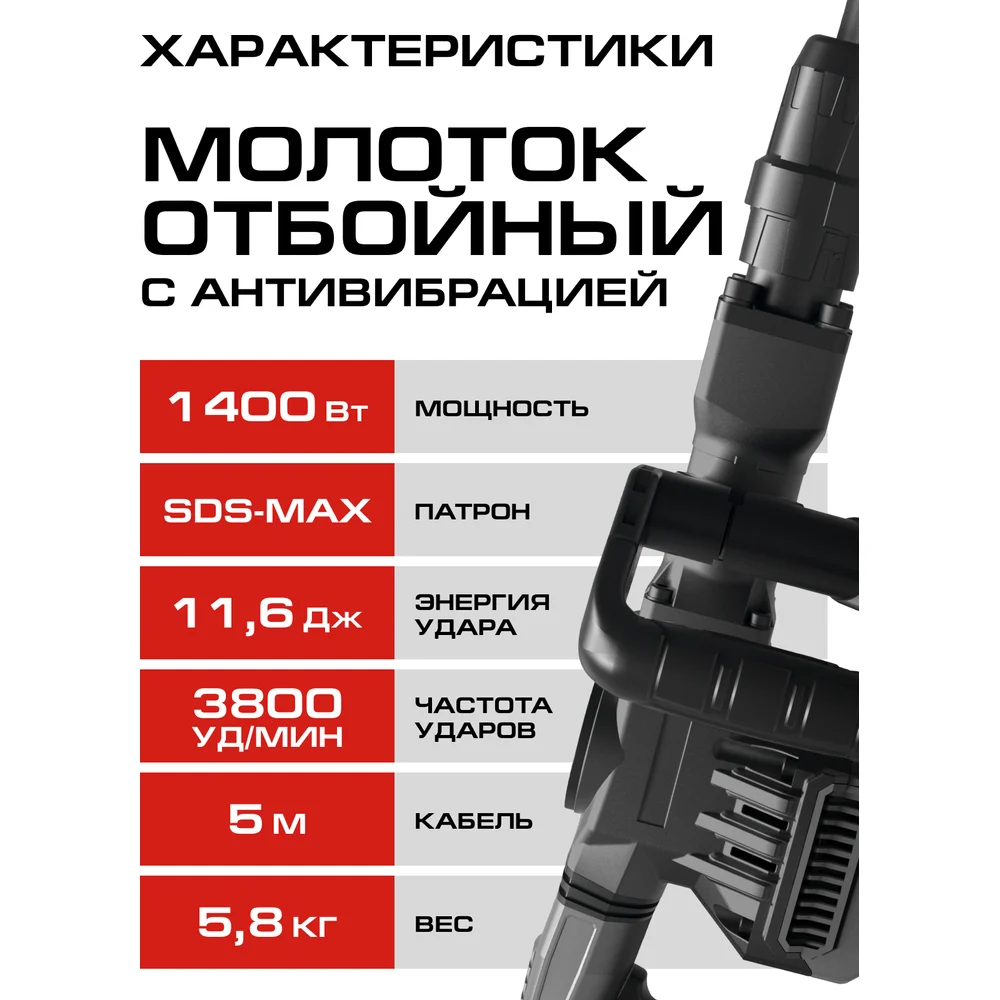 Молоток отбойный СТАВР SDS-MAX, 11,6Дж, 1400Вт, Stavr SDH 1400, 5,8кг, AVS, 3800уд/мин, кабель 5м (набор оснастки, кейс) 9030400124