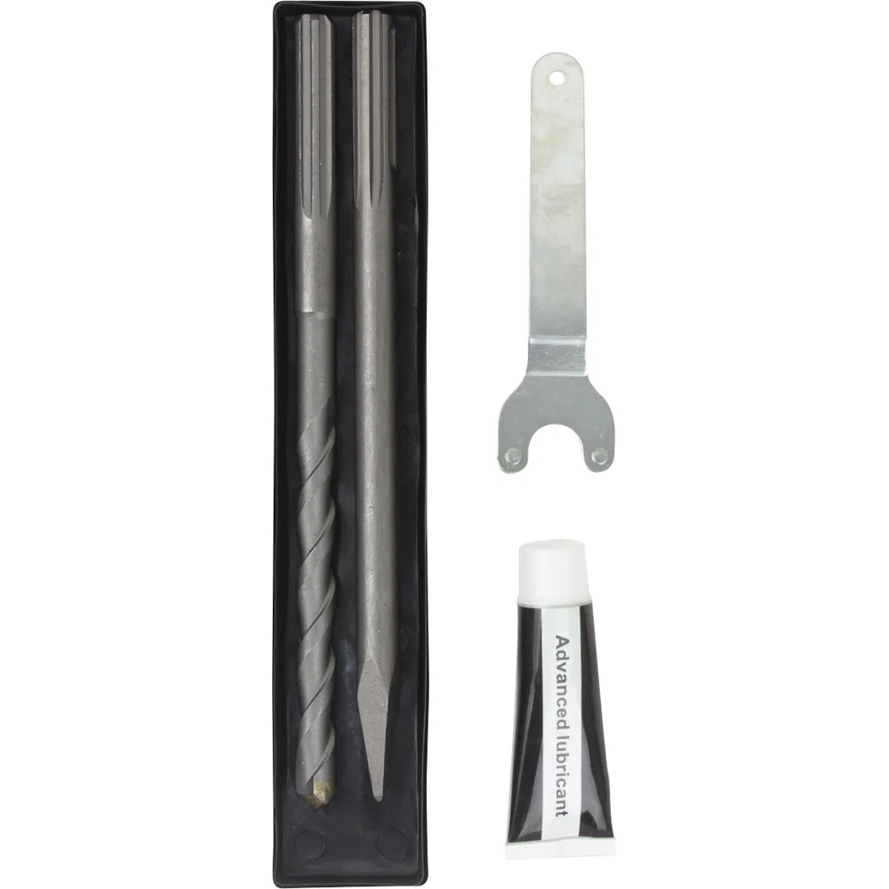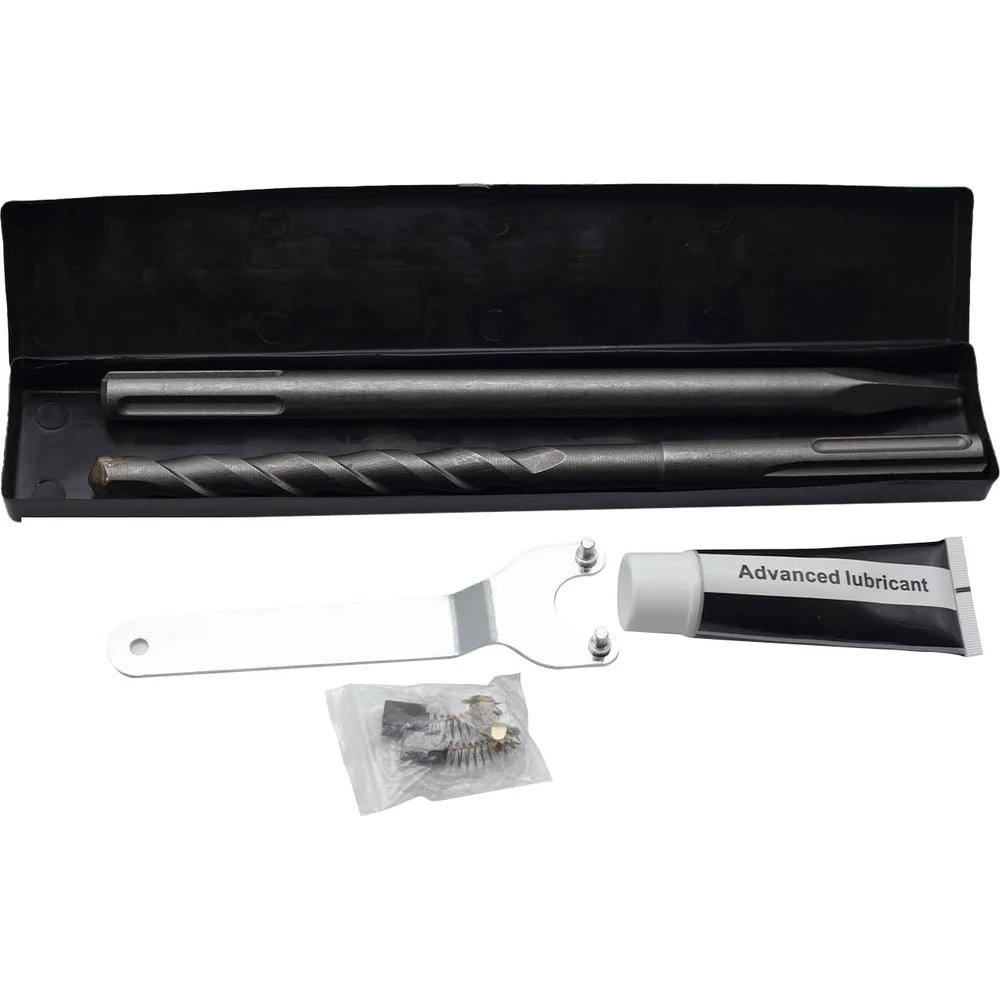 Комплектация Бур 1 шт.,; пика 1 шт.,; ключ 1шт.,; смазка 1 шт.,; коллекторные щетки пара,; кейс пластиковый,; руководство по эксплуатации; дополнительная рукоятка,