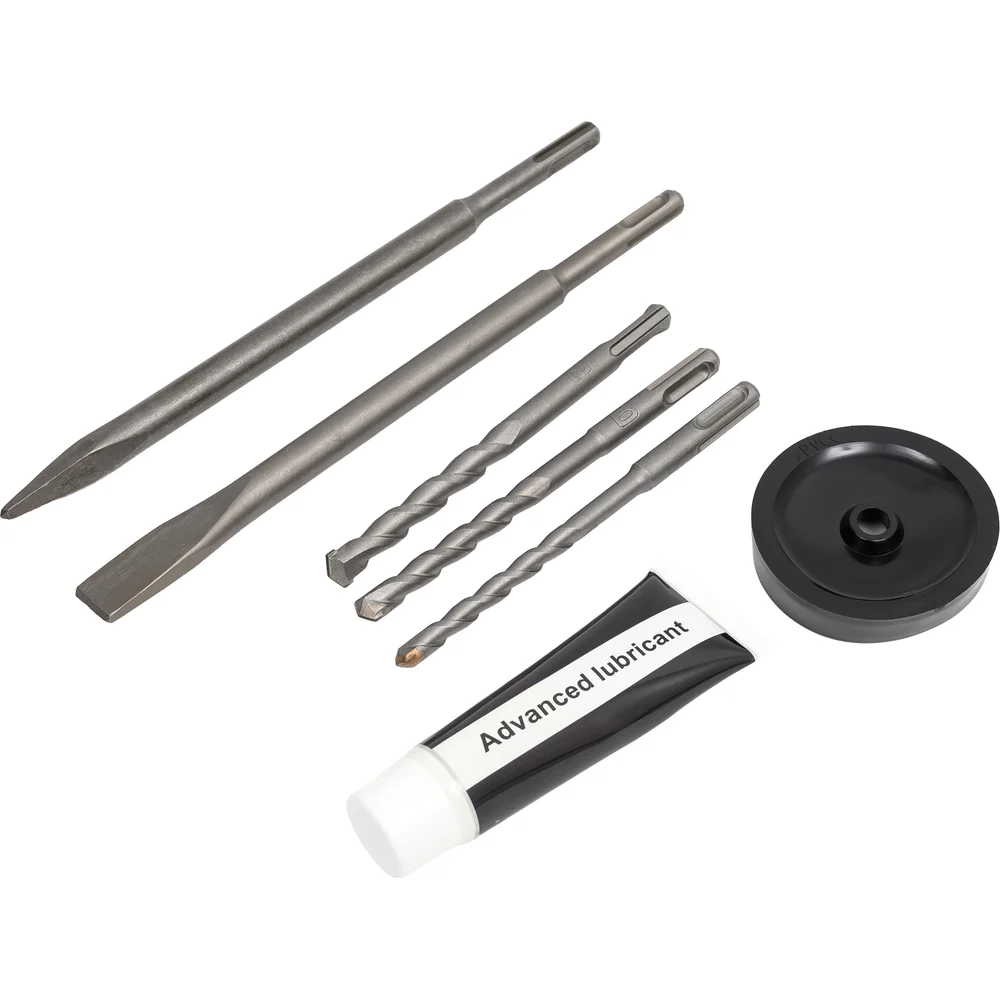 Комплектация Перфоратор; Инструкция; Регулируемая рукоятка; Ограничитель глубины; Набор сверл и зубил; Кейс