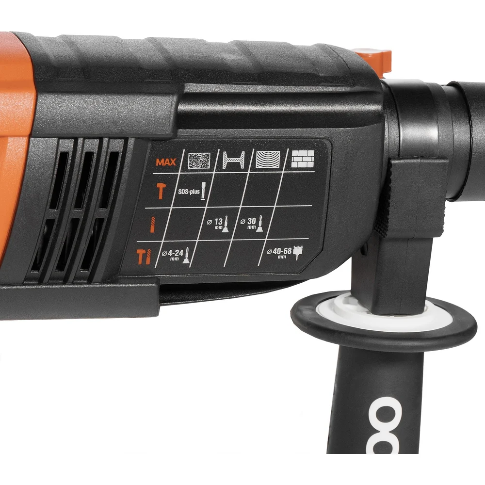 Комплектация Перфоратор; Дополнительная рукоятка; Измеритель глубины сверления/бурения; Буры 150 мм Ø 8/10/12 мм - 3 шт; Долото; Пика; Руководство пользователя; Гарантийный талон; Кейс