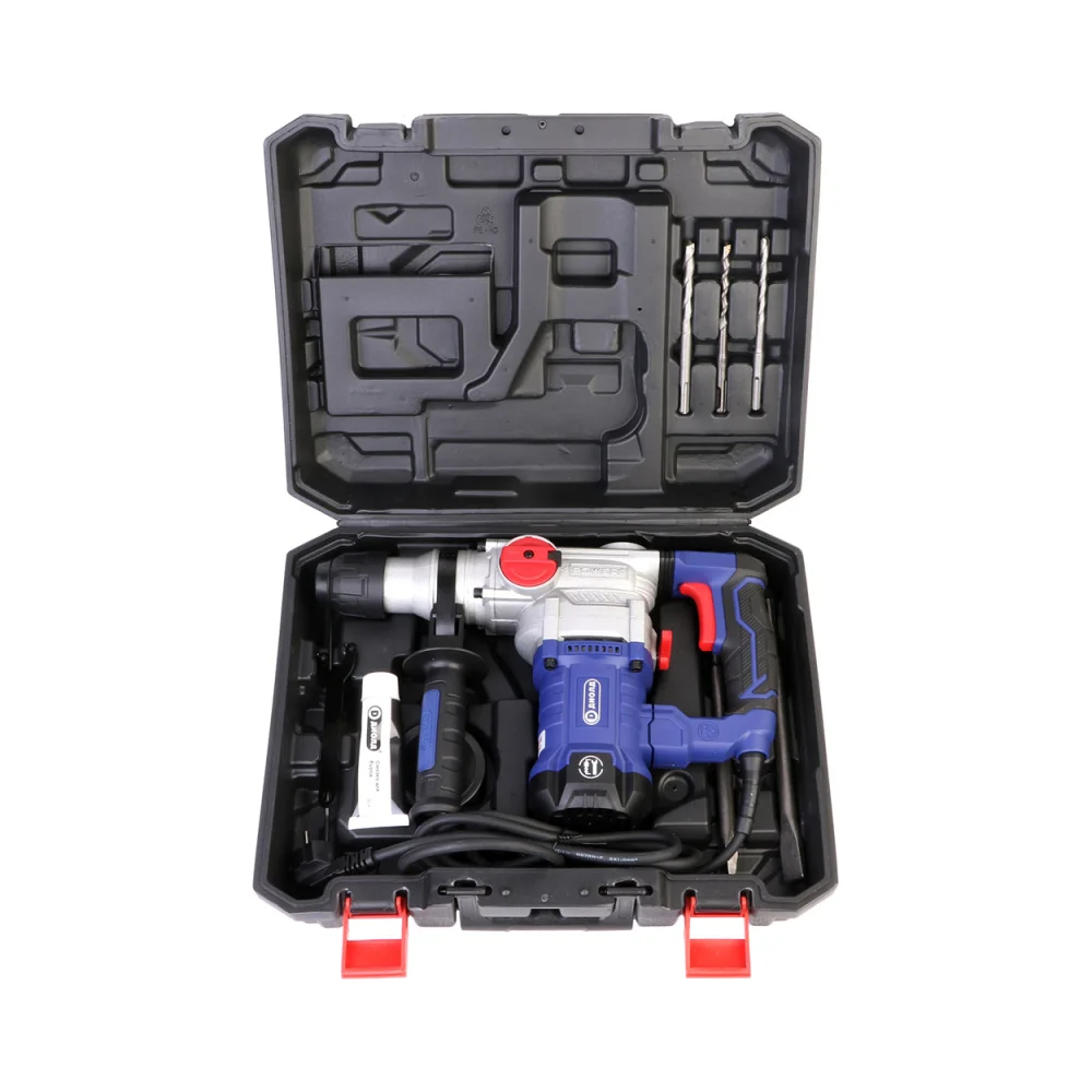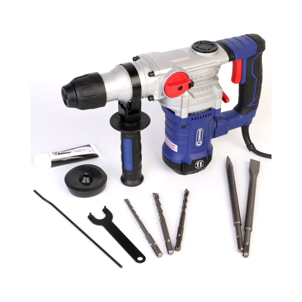 Комплектация Перфоратор; Руководство по эксплуатации; Адреса гарантийных мастерских; Щетка; Ключ специальный; Глубиномер; Зубило плоское; Зубило пикообразное; Кольцо пылезащитное; Упаковка (кейс); Буры с хвостовиком типа SDS-plus (6 мм; 8 мм; 10 мм) - 3 шт; Тюбик со смазочным материалом; Дополнительная рукоятка