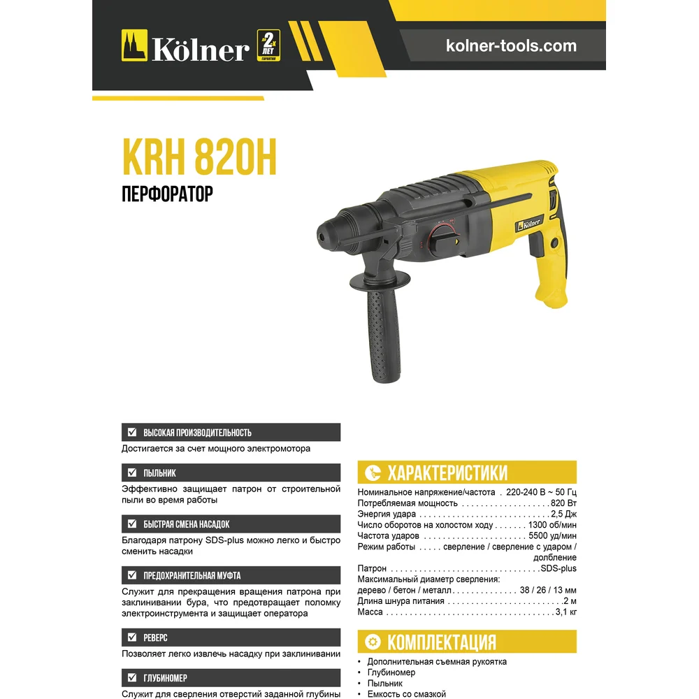 Купить Перфоратор Kolner KRH 820H 8030300236 по лучшей цене с доставкой - интернет магазин №1 в России