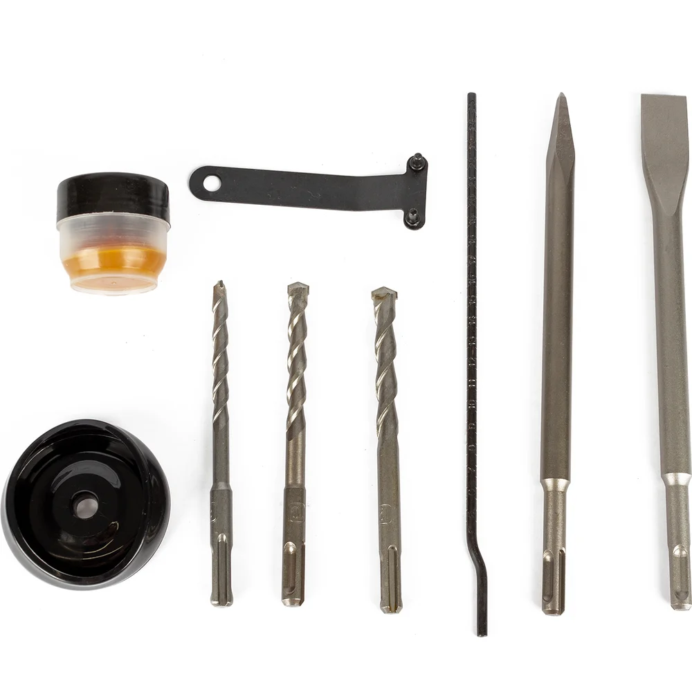 Комплектация Перфоратор; Руководство пользователя; Кейс; Дополнительная рукоятка; Буры SDS plus (8х150 мм, 10х150 мм и 12х150 мм) - 3 шт; Пика SDS plus 250 мм; Зубило SDS plus 250 мм; Баночка со смазкой; Пыльник патрона; Ограничитель глубины сверления; Специальный гаечный ключ