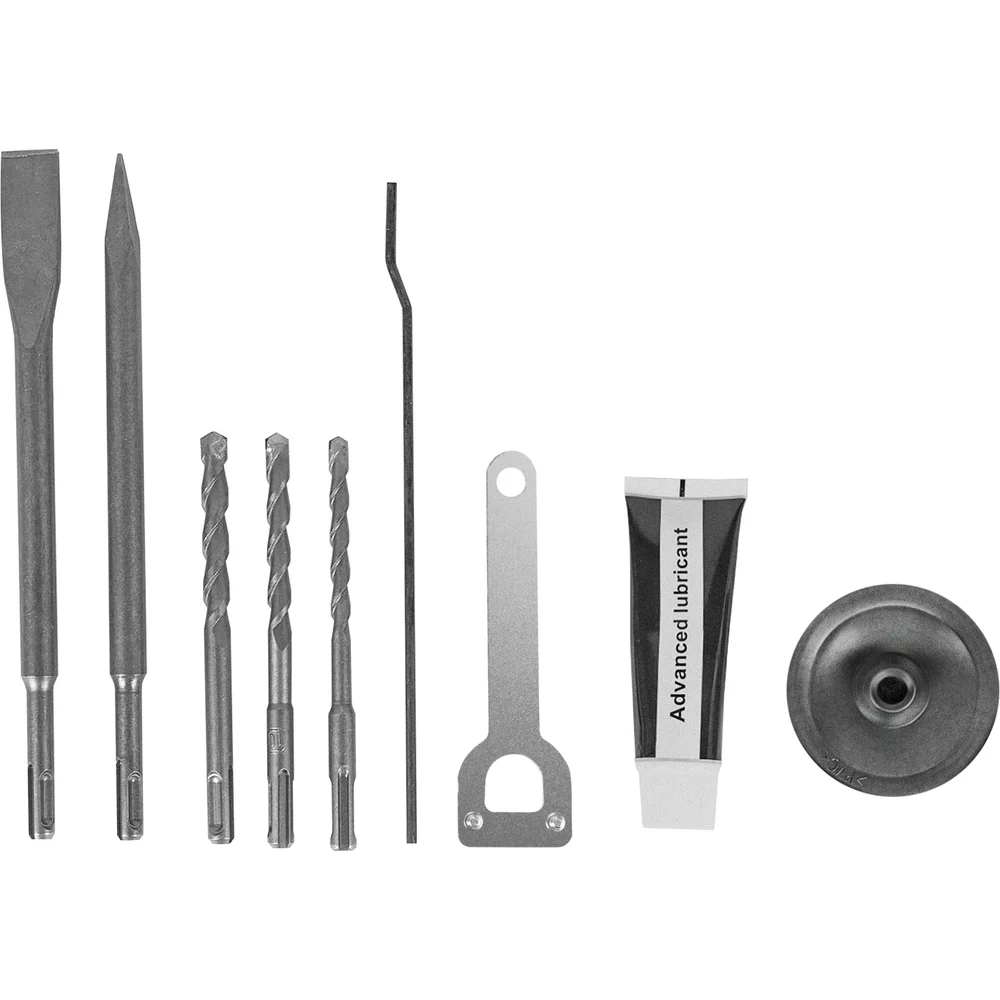 Комплектация Перфоратор электрический; Руководство по эксплуатации; Дополнительная съемная рукоятка; Глубиномер; Долото; Бур, 3 шт; Пика; Ключ отсека для смазки; Емкость со смазкой; Пыльник; Пластиковый кейс