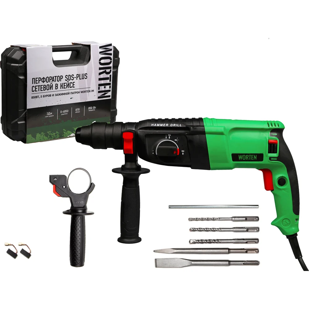Купить Перфоратор WORTEN SDS-plus сетевой в кейсе с набором 5 буров и зажимным патроном 850Вт КА-90000713 по лучшей цене с доставкой - интернет магазин №1 в России